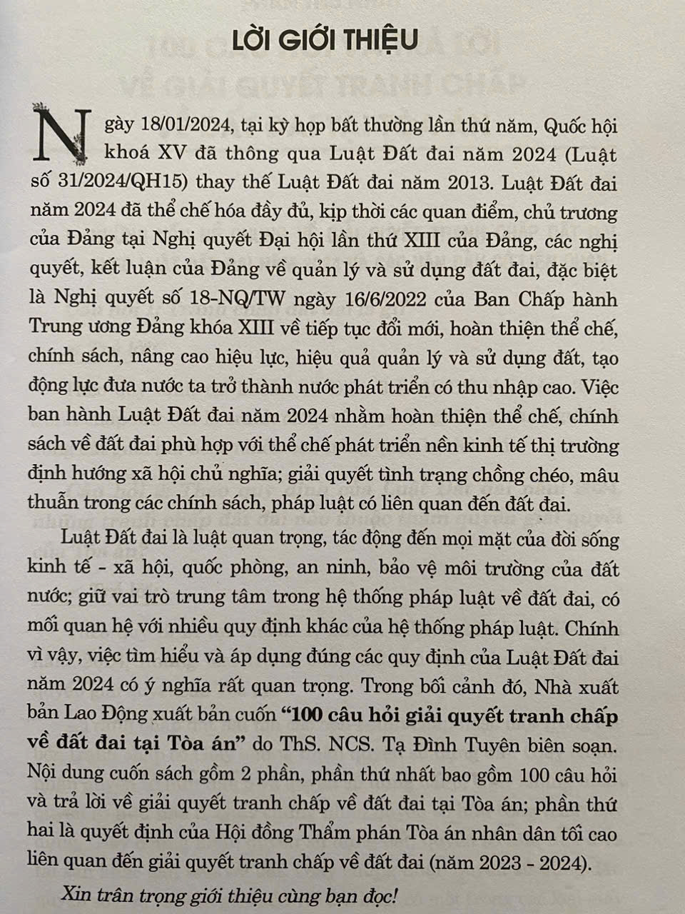 Luật Đất đai là luật quan trọng, tác động đến mọi mặt của đời sống kinh tế - xã hội, quốc phòng, an ninh, bảo vệ môi trường của đất nước; giữ vai trò trung tâm trong hệ thống pháp luật về đất đai, có mối quan hệ với nhiều quy định khác của hệ thống pháp luật. Chính vì vậy, việc tìm hiểu và áp dụng đúng các quy định của Luật Đất đai năm 2024 có ý nghĩa rất quan trọng. Trong bối cảnh đó, Luatvietbook xin trân trọng giới thiệu đến bạn đọc cuốn sách "100 CÂU HỎI GIẢI QUYẾT TRANH CHẤP VỀ ĐẤT ĐAI TẠI TOÀ ÁN" do ThS. NCS. Tạ Đình Tuyên biên soạn.