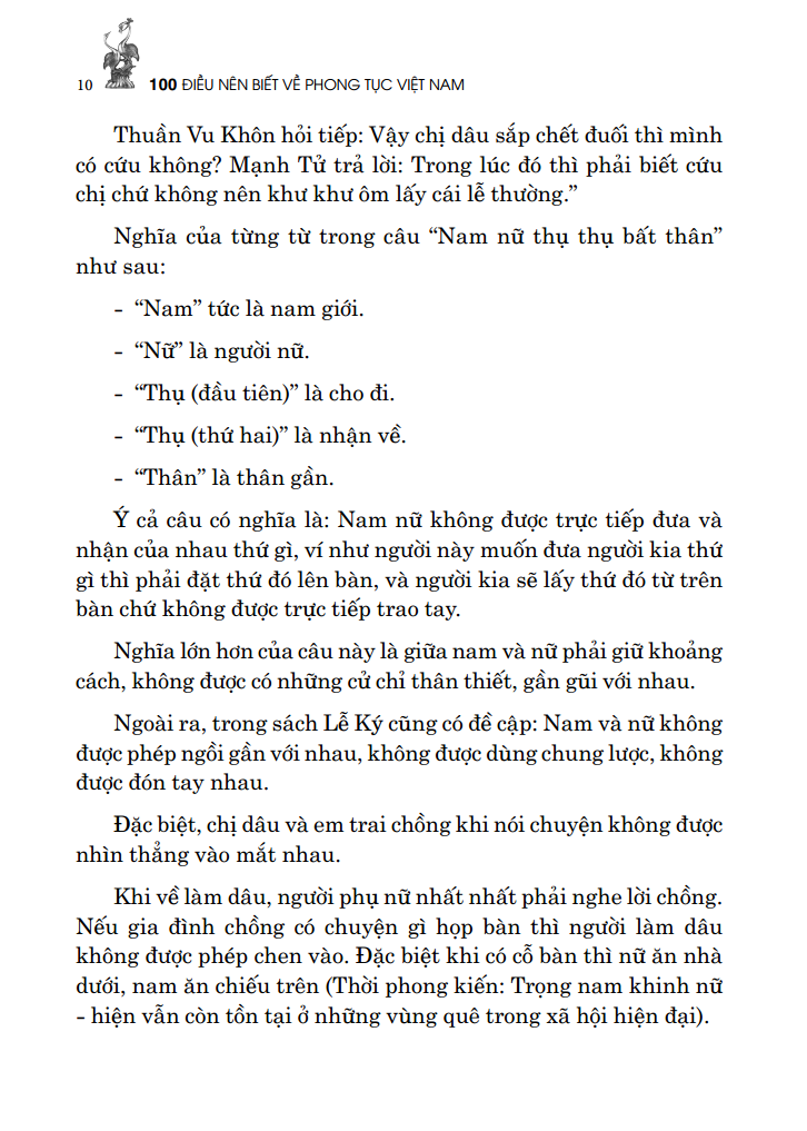 100 Điều Nên Biết Về Phong Tục Việt Nam giới thiệu một số phong tục, tập tục trong hiếu hỷ hay những ngày lễ tết lớn tiêu biểu nhất của Việt Nam. Hơn nữa, cuốn sách còn giới thiệu một số những tục lệ hay, những ngày lễ của các vùng miền và một số dân tộc tiêu biểu. Hầu hết các phong tục vẫn được duy trì đến ngày hôm nay, nhưng một số phong tục bị mai một đi theo thời gian và một số khác được chắt lọc hoặc được kết hợp với nhau cho phù hợp với xã hội hiện đại.