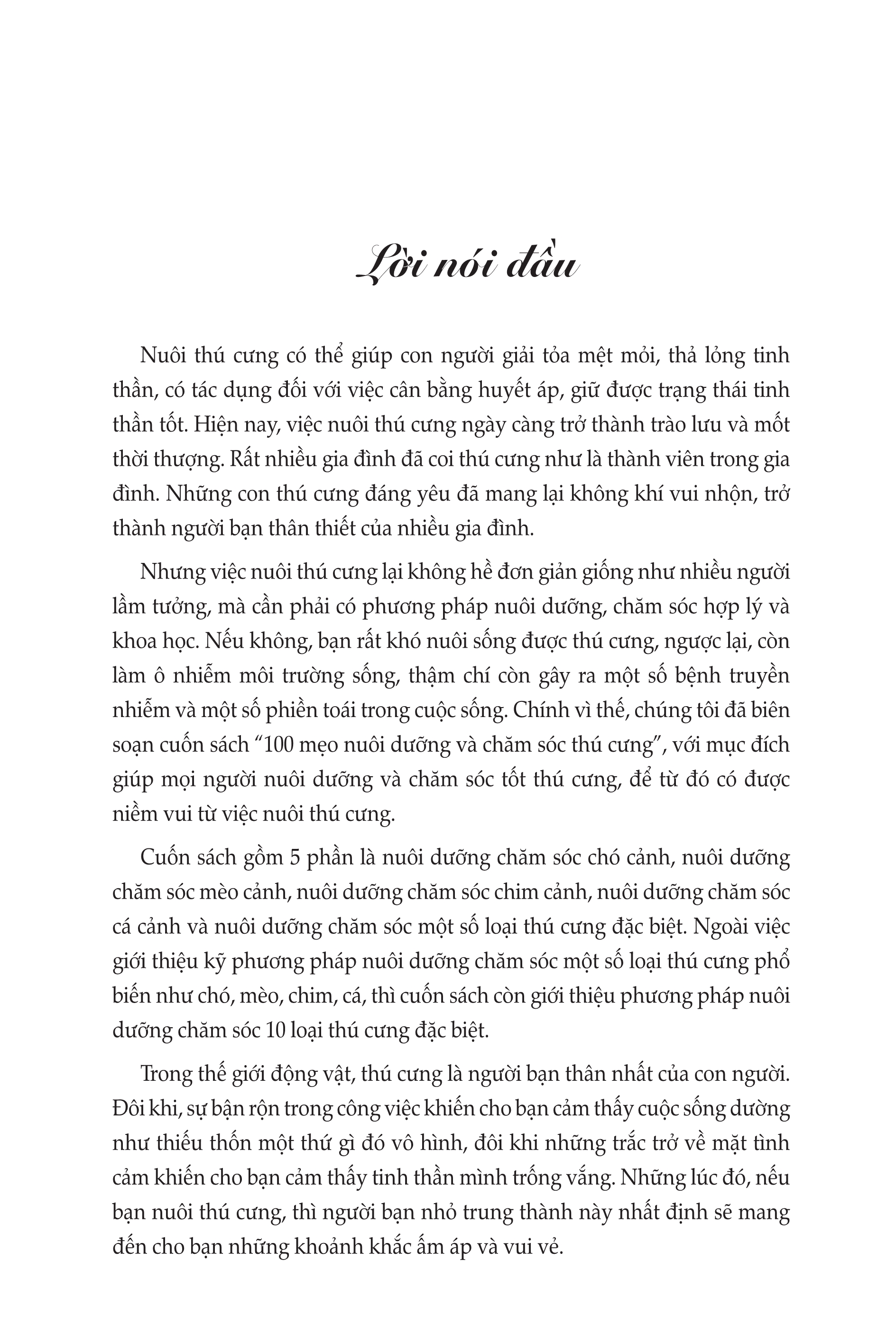 Nuôi thú cưng có thể giúp con người giải tỏa mệt mỏi, thả lỏng tinh thần, có tác dụng đối với việc cân bằng huyết áp, giữ được trạng thái tinh thần tốt. Hiện nay, việc nuôi thú cưng ngày càng trở thành trào lưu và mốt thời thượng. Rất nhiều gia đình đã coi thú cưng như là thành viên trong gia đình. Những con thú cưng đáng yêu đã mang lại không khí vui nhộn, trở thành người bạn thân thiết của nhiều gia đình. Nhưng việc nuôi thú cưng lại không hề đơn giản giống như nhiều người lầm tưởng, mà cần phải có phương pháp nuôi dưỡng, chăm sóc hợp lý và khoa học. Nếu không, bạn rất khó nuôi sống được thú cưng, ngược lại, còn làm ô nhiễm môi trường sống, thậm chí còn gây ra một số bệnh truyền nhiễm và một số phiền toái trong cuộc sống. Chính vì thế, chúng tôi đã biên soạn cuốn sách “100 mẹo nuôi dưỡng và chăm sóc thú cưng”, với mục đích giúp mọi người nuôi dưỡng và chăm sóc tốt thú cưng, để từ đó có được niềm vui từ việc nuôi thú cưng.