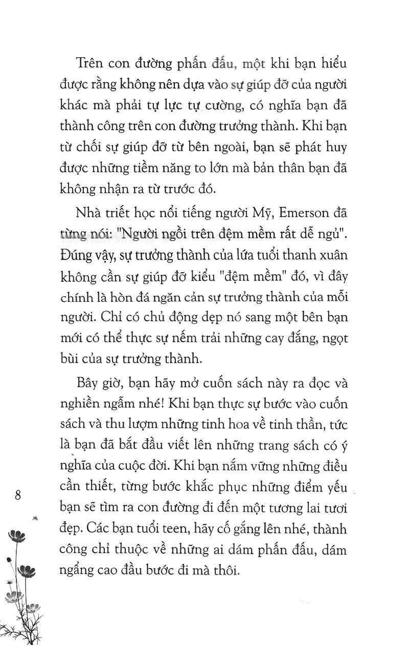 Hãy cảm nhận những trải nghiệm mà cuộc sống ban tặng, điều đó sẽ làm cho cuộc đời của các bạn trẻ trở nên dạn dày, sâu sắc, đồng thời cũng gợi cho các bạn suy nghĩ một cách lý tính hơn về cuộc sống. Phải trải qua khó khăn các bạn mới có thể minh mẫn, thấu hiểu và phát hiện được nhiều diều mới mẻ, Chỉ có người minh mẫn, thấu hiểu mới có thể có được cuộc sống tuyệt vời và sự sống cũng vì thế sinh động hơn.