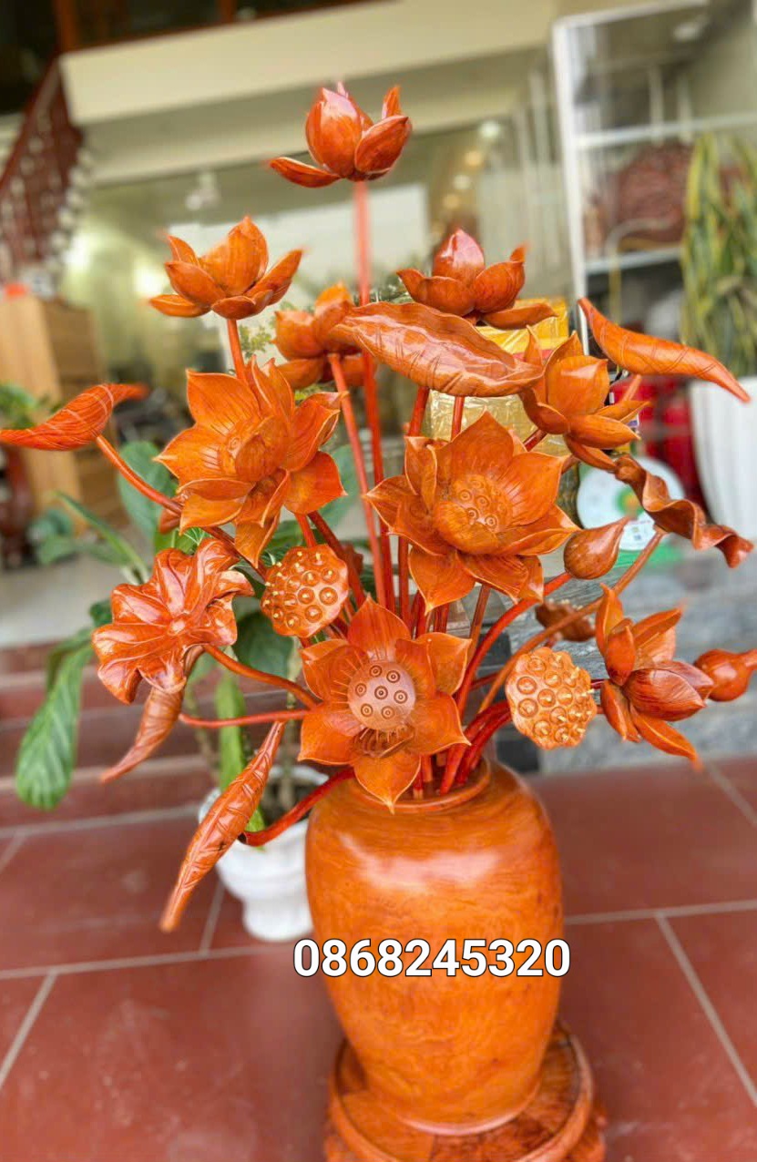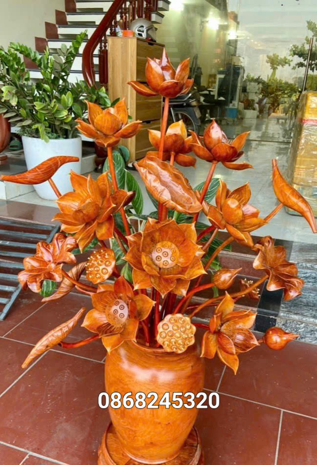 _ Bình hoa sen trang trí phòng khách ,phòng thờ được làm bằng chất liệu gỗ hương đỏ tự nhiên 100% _ Kt bình cắm 30×25cm ,kt cao tổng kể cả hoa lá gương 92cm