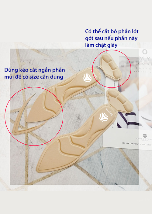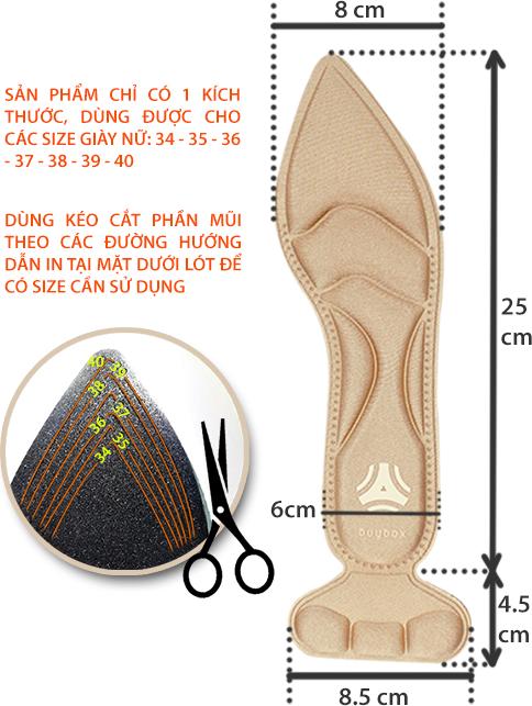 Mặt dưới miếng lót in các đường cong tương ứng các size 35 - 36 - 37 - 38 - 39 - 40. Dùng kéo cắt theo các đường cong này để có được kích thước cần sử dụng. Phần lót bọc gót sau có keo 3M để dán cố định vào sau giày.