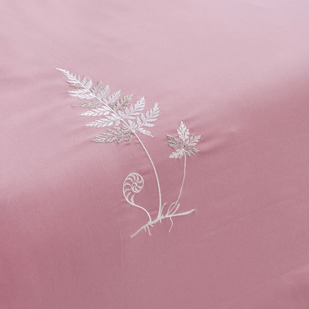 Những nhánh lá dương sỉ mảnh mai được thêu trên nền vải hồng nhạt, kết hợp cùng chỉ kim tuyến trắng lấp lánh như trên lá có một lớp nước đọng phản chiếu ánh sáng mặt trời.