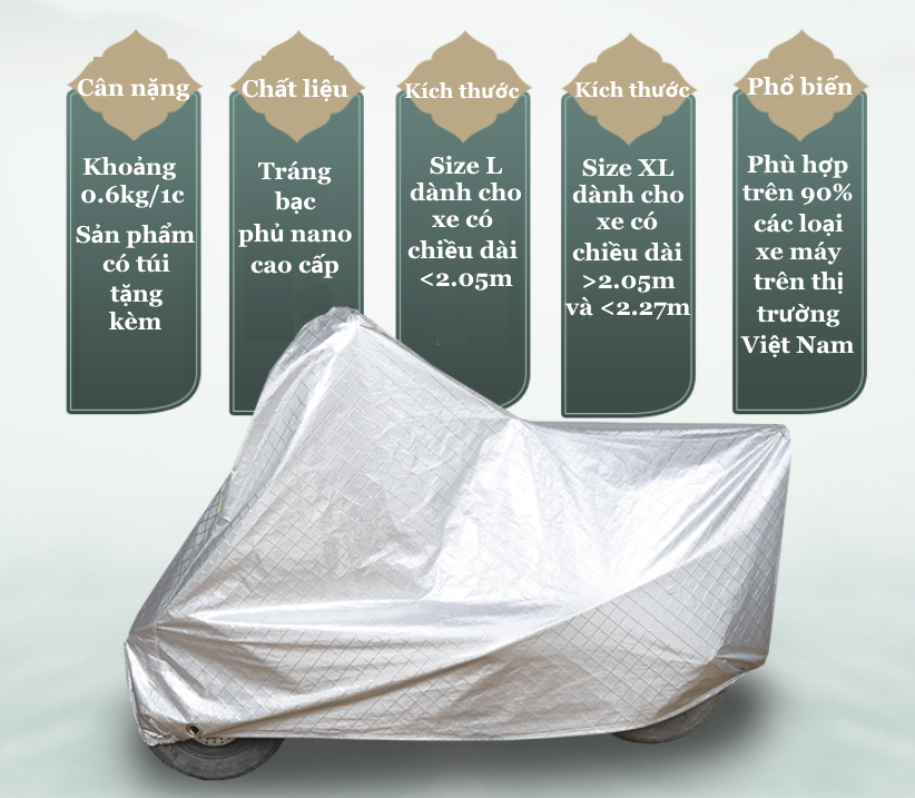 - size XL (dành cho xe có chiều dài > 2.05 và < 2.27m) dành cho xe Phân Khối Lớn với chiều dài <2.27m như: Z1000, CBR1000, SH300i, Beverly Piaggio, Honda PS.