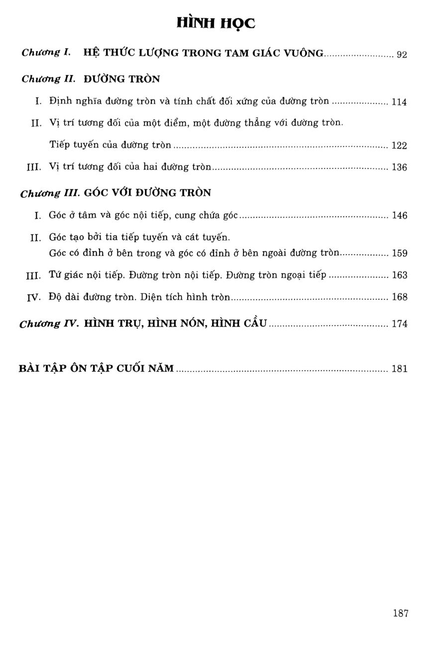 - Khái niệm hàm số II. Hàm số bậc nhất. III. Hệ số góc của đường thẳng y = ax + b (a ≠ 0). Bài tập ôn chương II... Chương III. HỆ PHƯƠNG TRÌNH BẬC NHẤT HAI ẨN I. Phương trình bậc nhất hai ẩn II. Hệ hai phương trình bậc nhất hai ẩn... III. Giải bài toán bằng cách lập hệ phương trình Bài tập ôn chương III Chương IV. HÀM SỐ y = ax2 (a ≠ 0) PHƯƠNG TRÌNH BẬC HAI MỘT ẨN I. Hàm số y = ax2 (a ≠ 0) II. Phương trình bậc hai một ẩn. III. Hệ thức Vi-ét và ứng dụng. IV. Phương trình quy về phương trình bậc hai V. Giải bài toán bằng cách lập phương trình bậc hai một ẩn Bài tập ôn chương IV HÌNH HỌC Chương I. HỆ THỨC LƯỢNG TRONG TAM GIÁC VUÔNG. Chương II. ĐƯỜNG TRÒN I. Định nghĩa đường tròn và tính chất đối xứng của đường tròn II. Vị trí tương đối của một điểm, một đường thẳng với đường tròn. Tiếp tuyến của đường tròn III. Vị trí tương đối của hai đường tròn. Chương III. GÓC VỚI ĐƯỜNG TRÒN I. Góc ở tâm và góc nội tiếp, cung chứa góc. II. Góc tạo bởi tia tiếp tuyến và cát tuyến. Góc có đỉnh ở bên trong và góc có đỉnh ở bên ngoài đường tròn.... III. Tứ giác nội tiếp. Đường tròn nội tiếp. Đường tròn ngoại tiếp IV. Độ dài đường tròn. Diện tích hình tròn. Chương IV. HÌNH TRỤ, HÌNH NÓN, HÌNH CẦU BÀI TẬP ÔN TẬP CUỐI NĂM Công ty phát hành: Nhà Sách Hồng Ân Năm Xuất Bản: 2025 Kích Thước: 17x24 cm Số Trang: 181 Nhà Xuất bản: Đại Học Sư Phạm Bìa: Mềm Tác Giả: TS. VŨ THẾ HỰU - NGUYỄN VĨNH CẬN