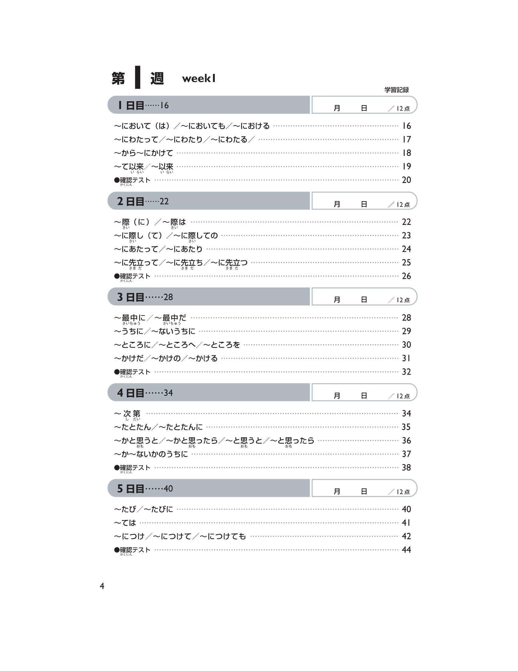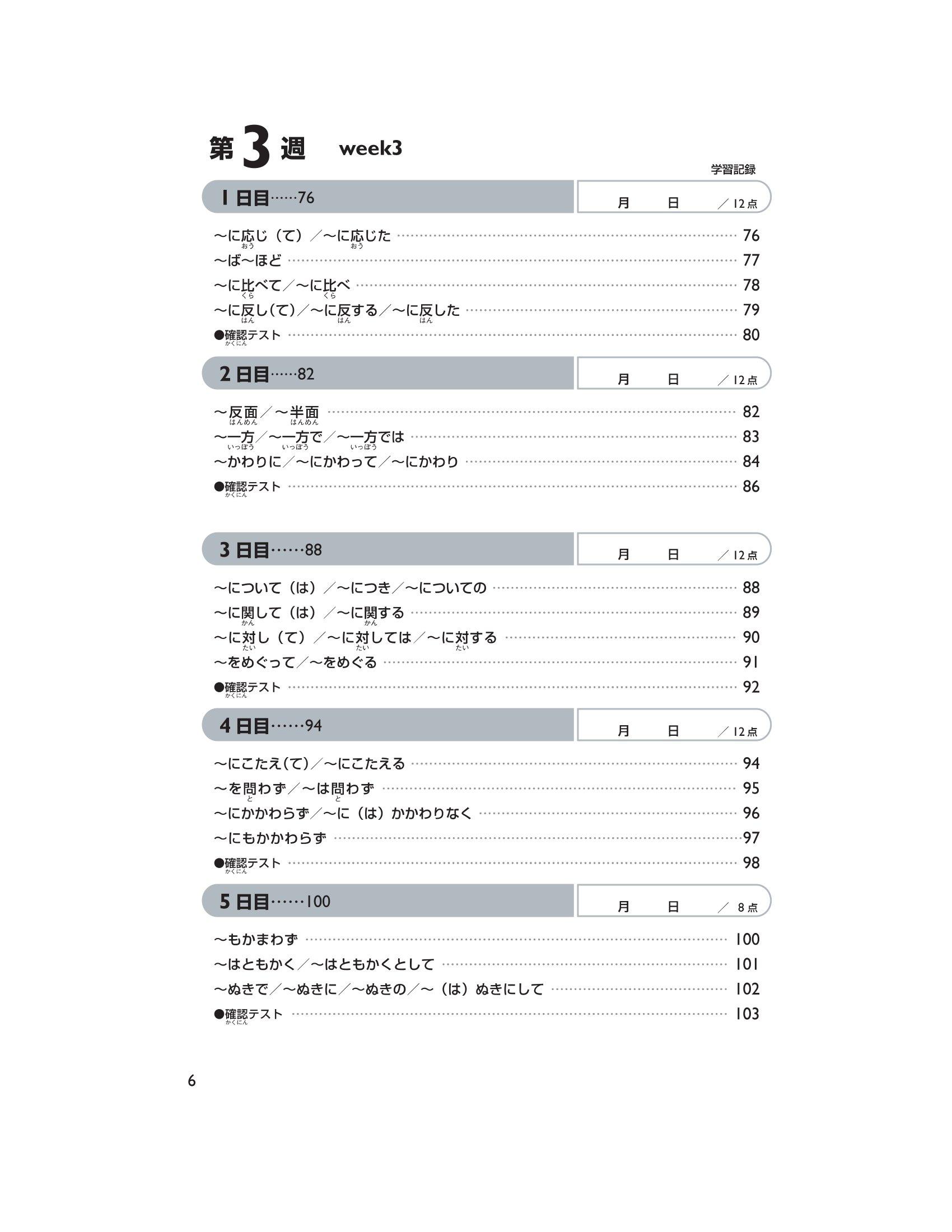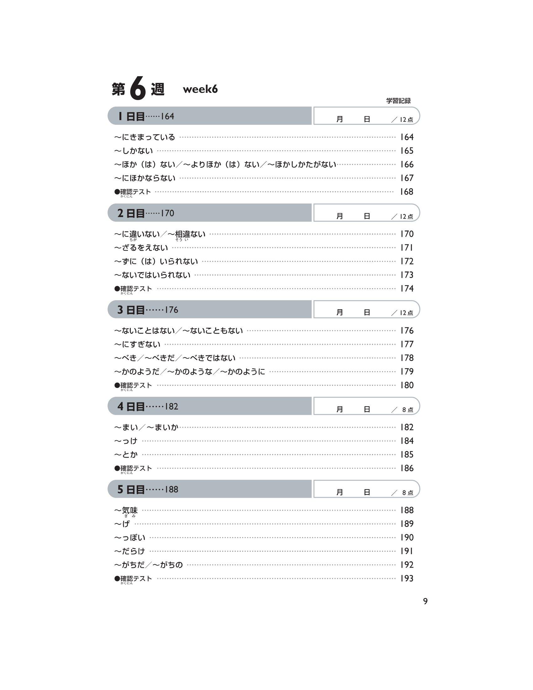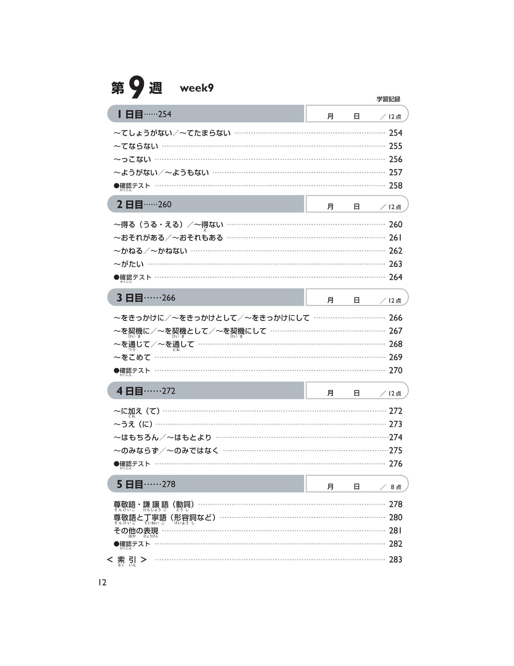 Trong phần này, chúng tôi đưa ra những Hán tự cần học, cách đọc của chúng (cách đọc âm kun ký hiệu bằng Hiragana, âm on ký hiệu bằng Katakana) và những câu ví dụ sử dụng những Hán tự trên. Mẫu câu đặc biệt tập trung vào việc đưa ra cách đọc và từ vựng chủ yếu dành cho trình độ N2. Ngoài ra, sẽ có bài kiểm tra lượng từ đã học mỗi ngày (khoảng 12 Hán tự). Đáp án được in tại phần dưới trang sách của ngày học tiếp theo. Hơn nữa, sẽ có câu hỏi thử thách ở ngày thứ 5 tuần thứ 4 và ngày thứ 5 tuần thứ 9.