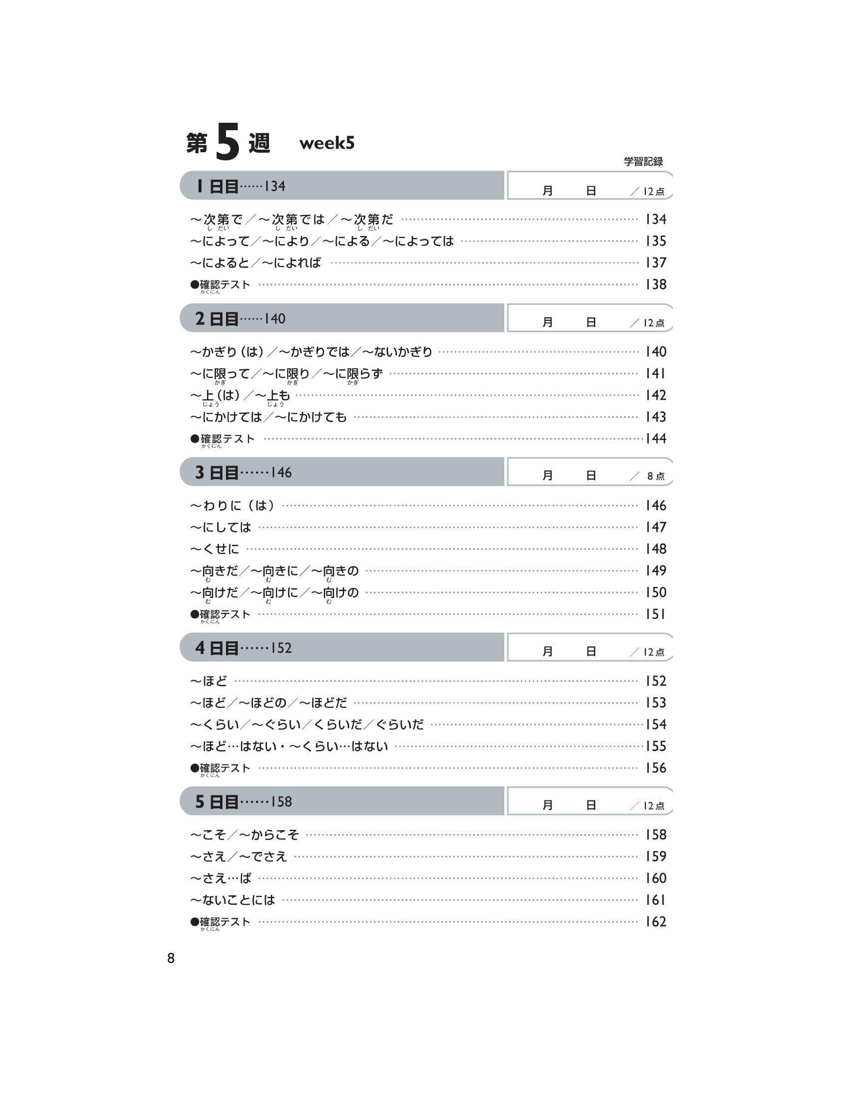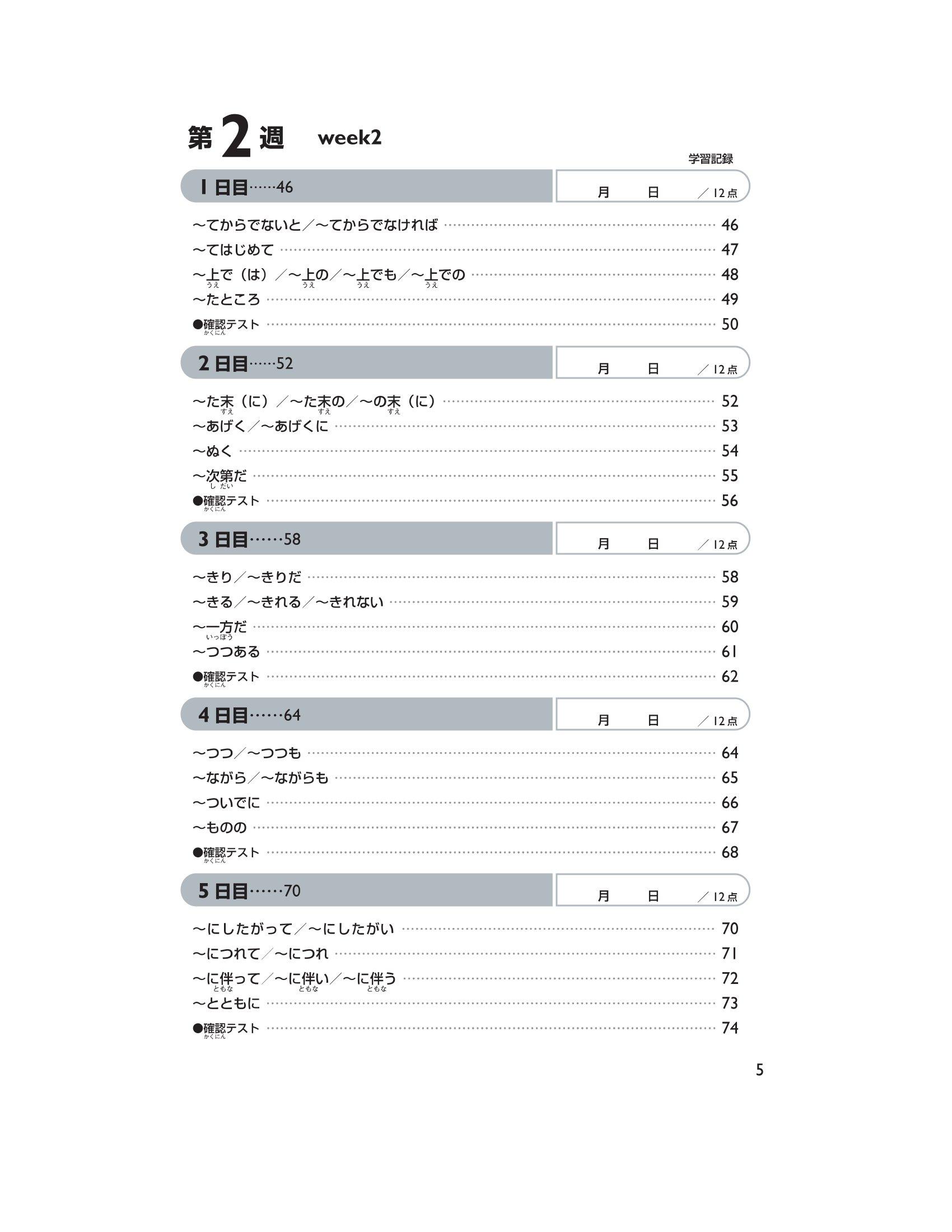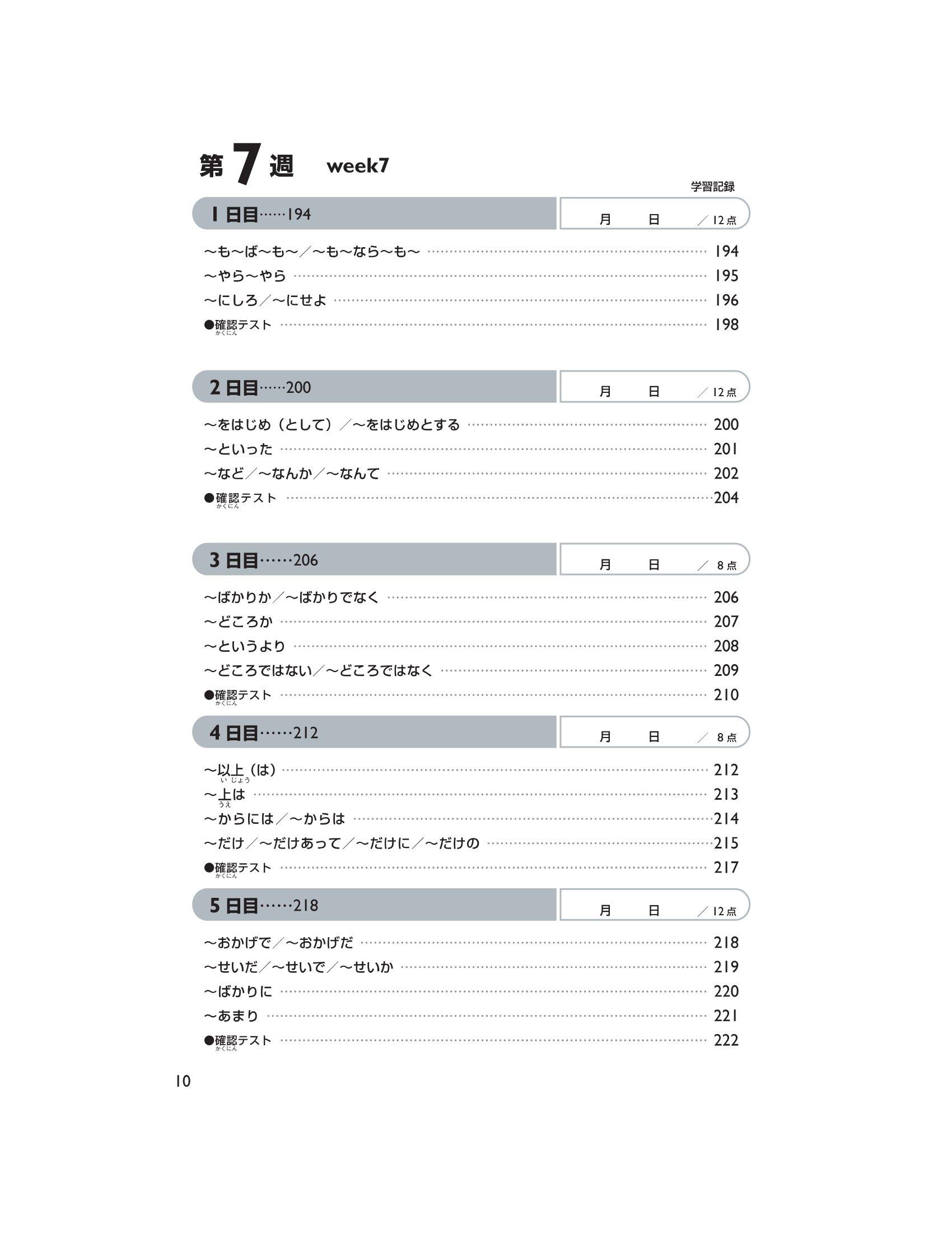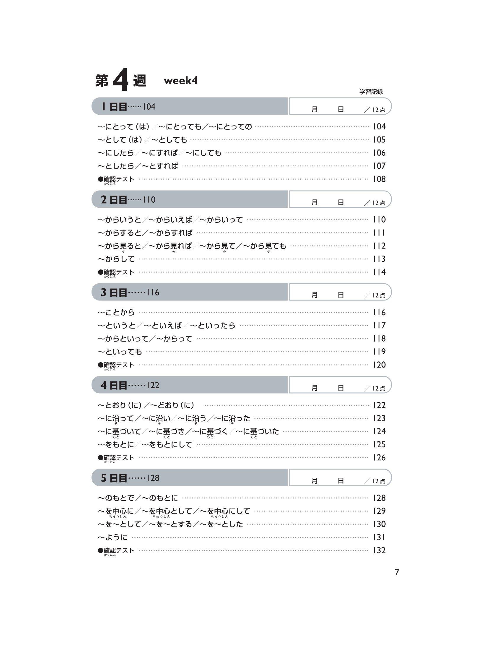 Trong phần này, chúng tôi đưa ra những Hán tự cần học, cách đọc của chúng (cách đọc âm kun ký hiệu bằng Hiragana, âm on ký hiệu bằng Katakana) và những câu ví dụ sử dụng những Hán tự trên. Mẫu câu đặc biệt tập trung vào việc đưa ra cách đọc và từ vựng chủ yếu dành cho trình độ N2. Ngoài ra, sẽ có bài kiểm tra lượng từ đã học mỗi ngày (khoảng 12 Hán tự). Đáp án được in tại phần dưới trang sách của ngày học tiếp theo. Hơn nữa, sẽ có câu hỏi thử thách ở ngày thứ 5 tuần thứ 4 và ngày thứ 5 tuần thứ 9.