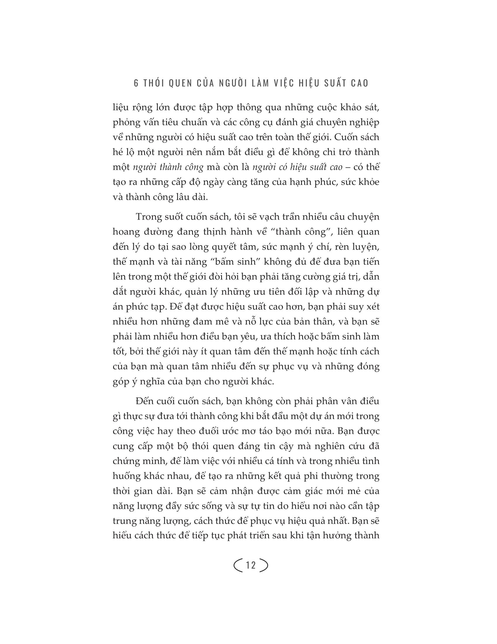 - Thể hiện lòng can đảm Cuốn sách “High performance habits – 6 thói quen của người làm việc hiệu suất cao” diễn giải chi tiết cách thức để thực hành những thói quen này. Cuốn sách đã tổng hợp những nghiên cứu trong 20 năm của tác giả Brendon Burchard từ hoạt động huấn luyện của mình. Đây là các tổng kết đắt giá nhất có được nhờ các cuộc khảo sát, phỏng vấn tiêu chuẩn và các công cụ đánh giá chuyên nghiệp về những người có hiệu suất cao trên toàn thế giới. Tác phẩm hé lộ một người nên nắm bắt điều gì để trở thành một người hiệu suất cao – có thể tạo ra những cấp độ ngày càng tăng của hạnh phúc, sức khỏe và thành công lâu dài. Nếu bạn muốn hình thành một thói quen nào mới để thành công nhanh hơn, hãy chọn những thói quen trong cuốn sách này. Bất cứ ai cũng có thể thực hành chúng, và bạn sẽ thấy những điều phi thường xảy ra trong cuộc sống, các mối quan hệ và sự nghiệp. Nếu bạn muốn đạt được nhiều thứ hơn, lãnh đạo tốt hơn, phát triển kĩ năng nhanh hơn, hoặc đạt được nhiều niềm vui và tự tin hơn, “High performance habits – 6 thói quen của người làm việc hiệu suất cao” sẽ trợ giúp đắc lực cho bạn.