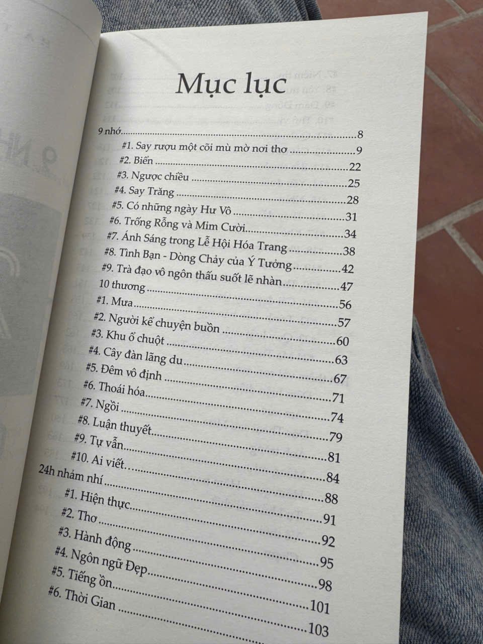 Sách được chia thành bốn phần: “9 nhớ”, “10 thương”, “24 giờ nhảm nhí” và “Rớt thêm vài cơn mơ”. Mỗi phần mang đến một màu sắc riêng, tựa như những lát cắt của cuộc sống và tâm hồn. “9 nhớ” dẫn dắt người đọc qua những miền cảm xúc sâu lắng, nơi cơn say của thơ ca, những ngày trống rỗng và cả ánh sáng mờ ảo trong các lễ hội hóa trang được phác họa với ngôn ngữ giàu hình ảnh và chiều sâu triết lý. Ở đó, Hà Thủy Nguyên gợi lên những trạng thái tâm hồn đầy mâu thuẫn – vừa giằng xé vừa an yên, vừa hiện thực vừa mơ hồ, khiến người đọc như lạc bước vào một thế giới song song của chính mình. Trong “10 thương,” tác giả dồn nén những trăn trở, đau đáu về đời sống. Từ những cơn mưa thoáng qua đến những suy tư về sự sống và cái chết, mỗi bài viết là một mảnh ghép đầy suy tư về kiếp nhân sinh. Không tô hồng hay bi lụy, Hà Thủy Nguyên phơi bày sự mong manh của đời người, để rồi từ đó, người đọc nhận ra những giá trị sâu sắc ẩn trong từng khoảnh khắc hiện hữu. “24 giờ nhảm nhí,” lại là một bức tranh hỗn loạn nhưng đầy sức sống của đời sống hiện đại. Dưới ngòi bút của Hà Thủy Nguyên, những điều tưởng chừng vụn vặt, ngẫu nhiên lại trở thành những khúc ca sống động về nhân sinh. Đây là nơi cảm xúc và tư duy hòa quyện, nơi cái đẹp được tìm thấy ngay cả trong sự hỗn độn. Phần cuối, “Rớt thêm vài cơn mơ”, như một lời tự sự nhẹ nhàng nhưng ám ảnh, dẫn dắt người đọc đi qua những cung bậc cảm xúc sâu kín nhất. Đó là những khoảnh khắc khi con người đối diện với chính mình, giữa những giấc mơ dang dở, những nỗi đau chưa kịp lành và những khát vọng vẫn âm ỉ cháy trong lòng. Phần kết để lại dư âm lặng lẽ, tựa như một giấc mơ chợt tan nhưng vẫn lưu lại trong lòng người đọc những câu hỏi không lời đáp về ý nghĩa của tồn tại.