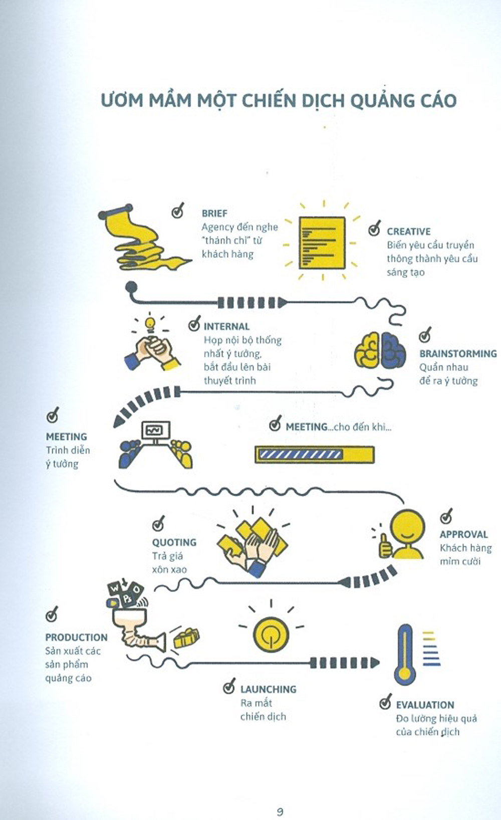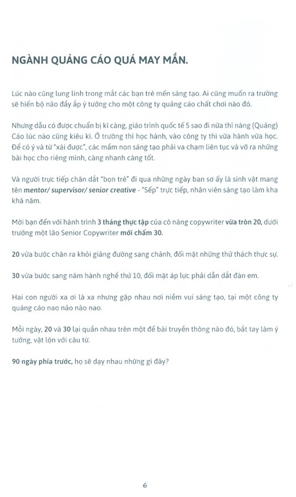 Nhưng dẫu có được chuẩn bị kĩ càng, giáo trình quốc tế 5 sao đi nữa thì nàng (Quảng) Cáo lúc nào cũng kiêu kì. Ở trường thì học hành, vào công ty thì vừa hành vừa học. Để có ý tưởng và câu chữ xài được, các “mầm non sáng tạo” phải va chạm liên tục và tự mình vỡ lấy những bài học, càng nhanh càng tốt, không được để deadline qua mặt.