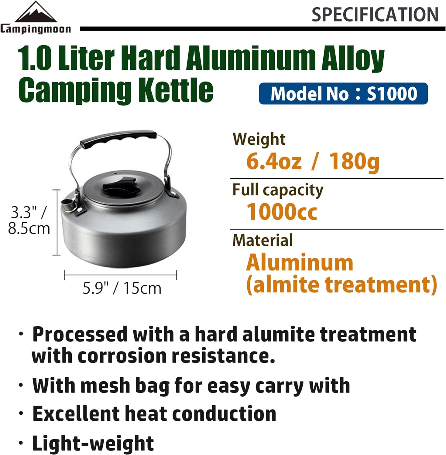 Ấm đun nước bằng nhôm Campingmoon S1000 (1 lít) bằng hợp kim nhôm cứng 1,0 lít này có trọng lượng chỉ 180gram nhẹ và nhỏ gọn để cắm trại, dã ngoại.
