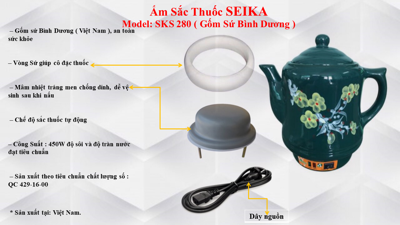 Dung tích 2.8L Ấm Sắc Thuốc Seika 2.8L - SKS280 (Gốm Sứ Bình Dương) được làm từ gốm sứ Bình Dương loại 2.8L có sức chịu nhiệt cao, bề mặt láng mịn dễ dàng vệ