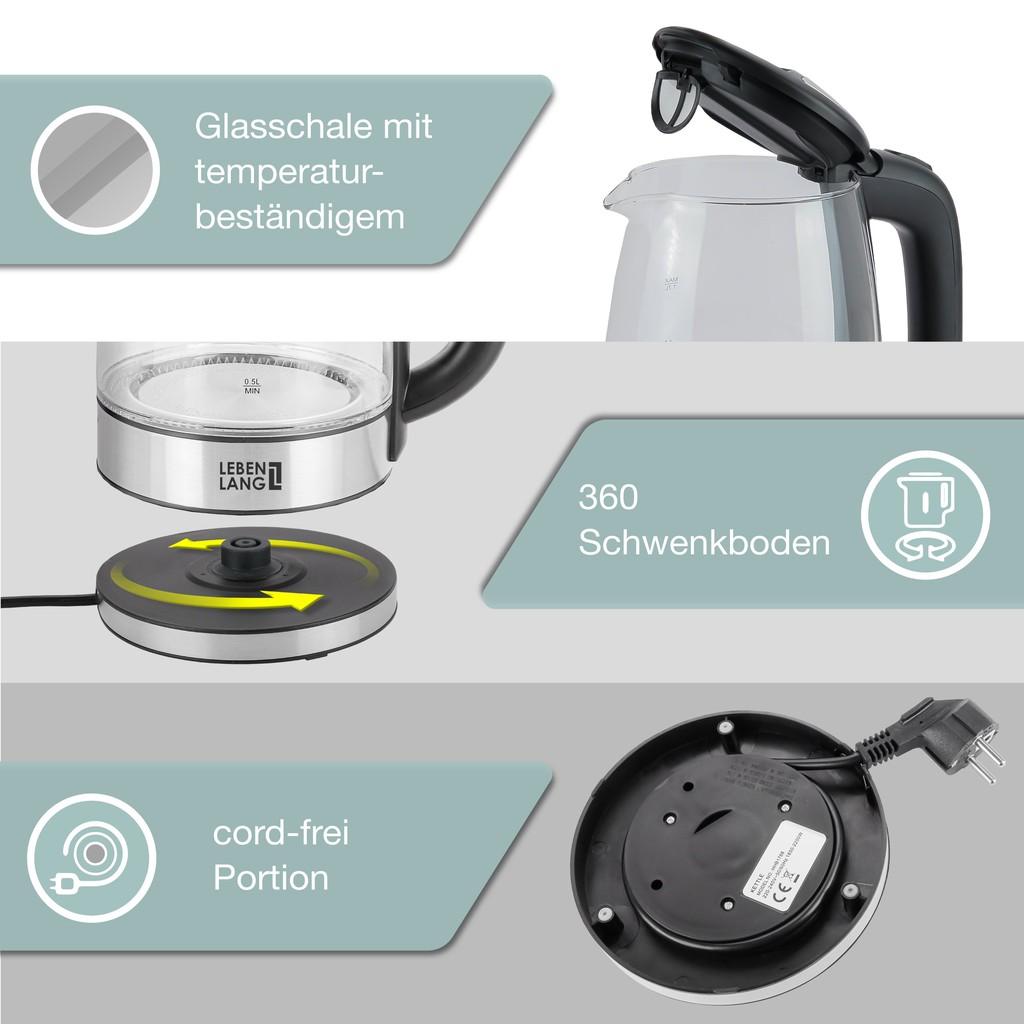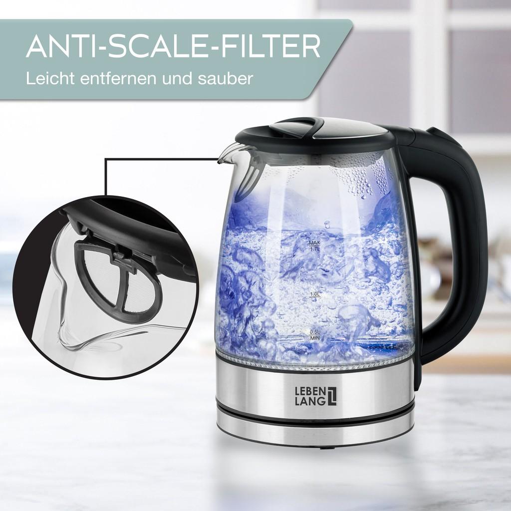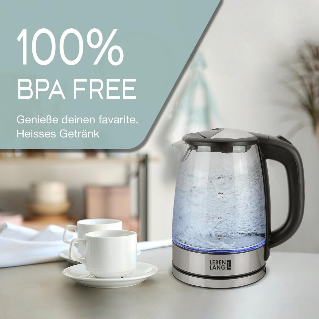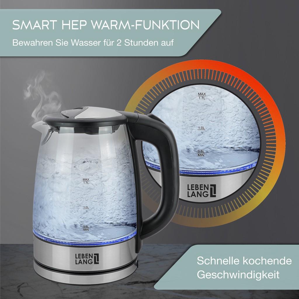 Ấm siêu tốc 1.8 lít bình thủy tinh LEBENLANG từ Đức gồm lõi lọc trà bằng inox, bảo hành 2 năm