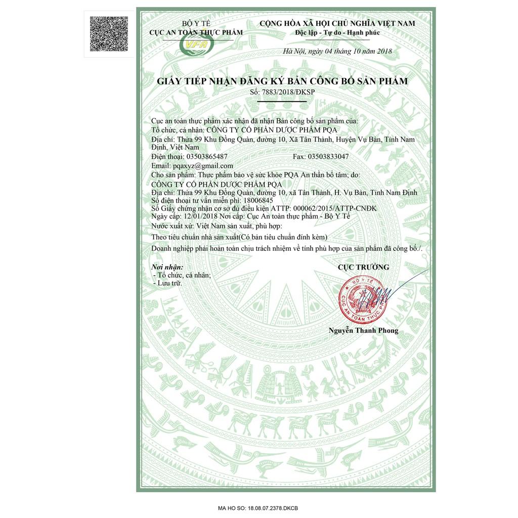 - Địa chỉ sản xuất: Công ty Cổ phần Dược phẩm PQA. Thửa 99, Khu Đồng Quàn, Xã Tân Thành, Huyện Vụ Bản, Tỉnh Nam Định. THÀNH PHẦN: