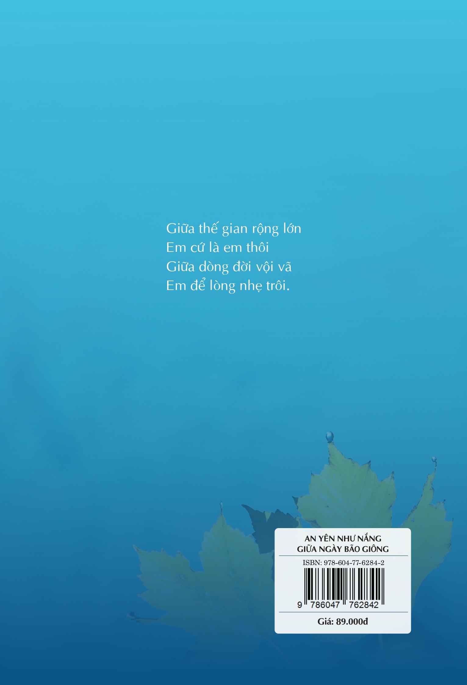 Tập thơ “ An yên như nắng giữa ngày bão giông” là sự kết hợp, hòa quyện giữa thơ và hình ảnh. Những lời tự sự nhẹ nhàng, sâu lắng, những khung hình thiên nhiên tươi đẹp, đầy chất thơ được ghi lại qua mỗi chuyến đi để cảm nhận sâu sắc hơn về cuộc đời, để kết nối với chính m.ình và kết nối m.ình với thế giới xung quanh.