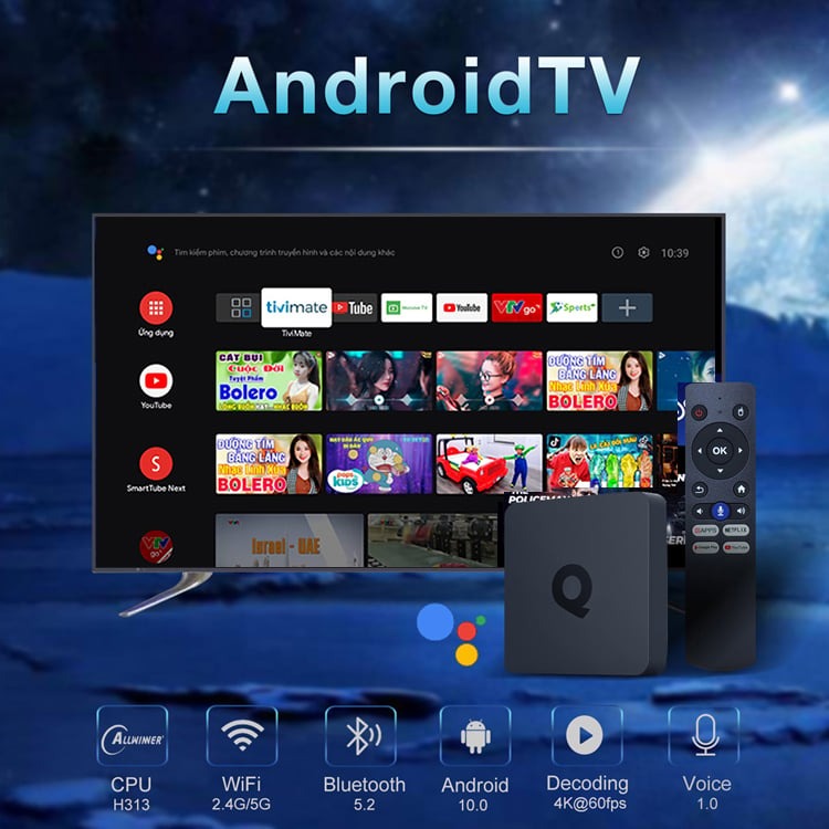 Smart box android tv Q mới có điều khiển giọng nói tiếng việt hỗ trợ bluetooth Wifi băng tần kép Cài sẵn chương trình tivi và xem phim HD miễn phí vĩnh viễn Nhằm đáp