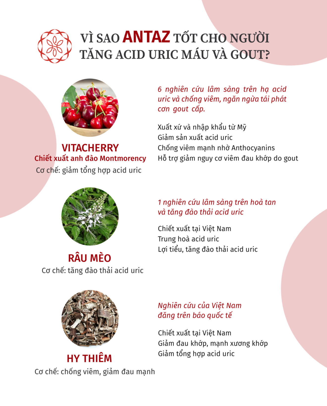 Mua tại TiktokANTAZ là sự kết hợp hoàn hảo của 3 thành phần: Vitacherry (Anh đào Montmorency), Hy Thiêm và Râu mèo Vitacherry (Nhập khẩu từ Mỹ): sử dụng rộng rãi ở Mỹ để hỗ trợ giảm acid uric máu và ngăn ngừa gout