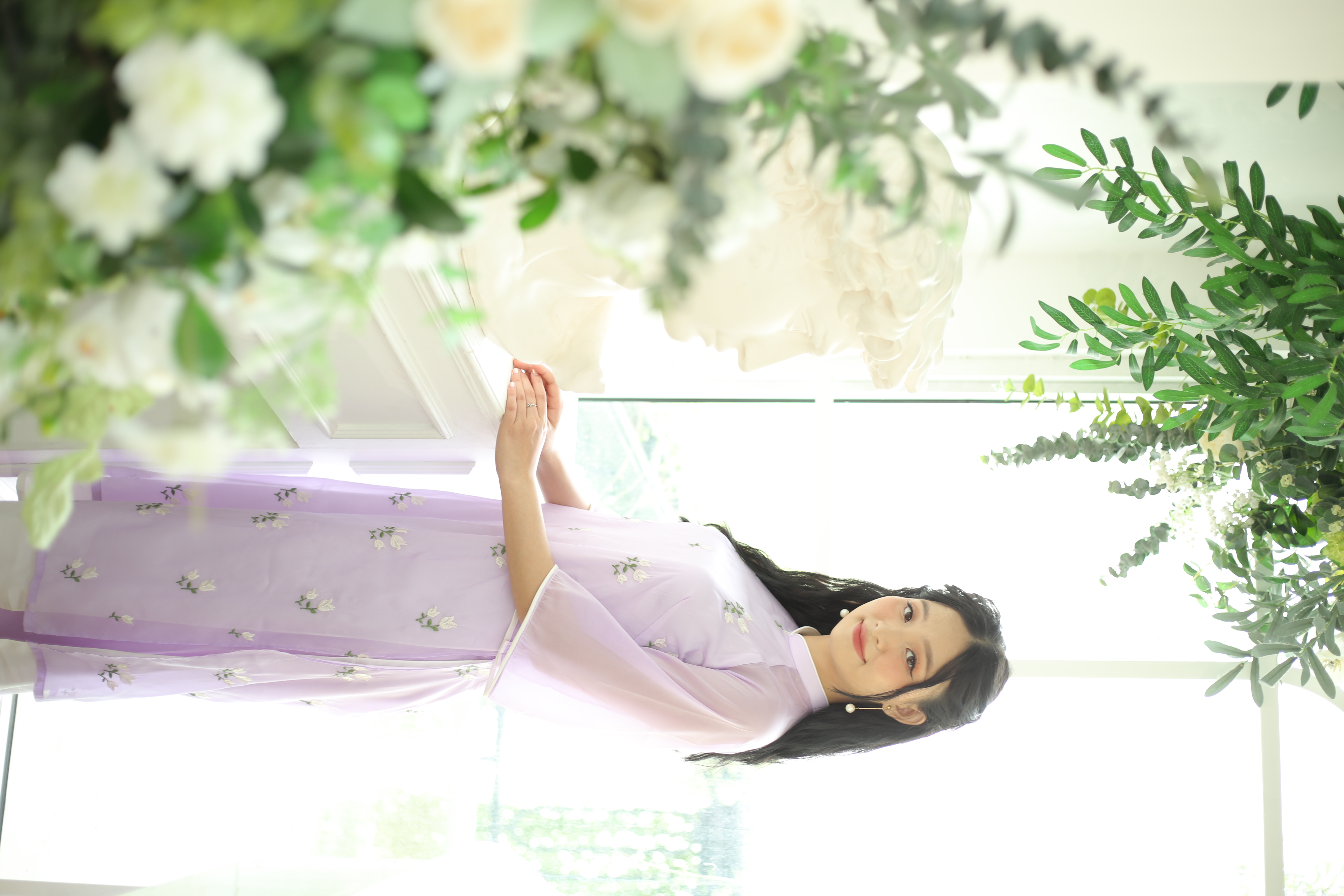 áo dài cách tân thiết kế form suông 4 tà màu tím hoa cà thêu hoa lá, lót lụa bên trong, tay lỡ loe viền trắng, quần lụa tím hoa cà