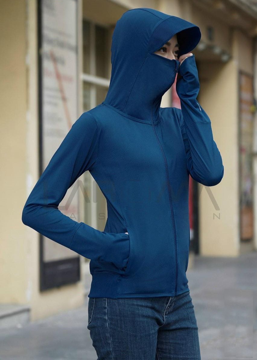 - Mũ rất to che nắng hiệu quả, tay áo có lỗ xỏ ngón cái, dây kéo dài che mặt có thể thay thế cho khẩu trang.
