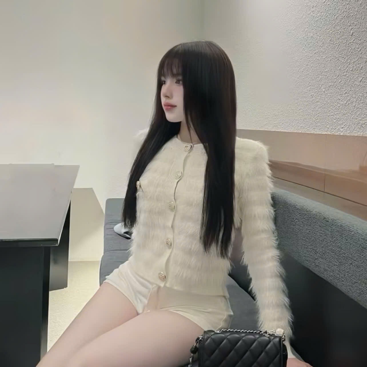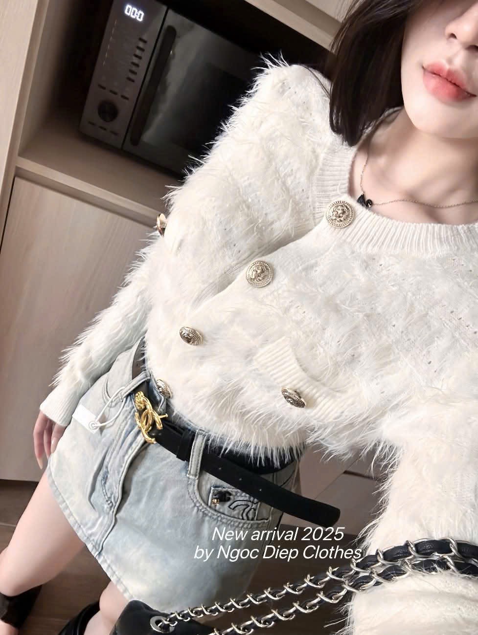Mua tại TiktokChất len lông thỏ mềm mịn, sờ cực êm tay, lên form sang xịn • Thiết kế tay dài, hàng nút vàng nổi bật tạo điểm nhấn thanh lịch • Dễ phối cùng váy, quần