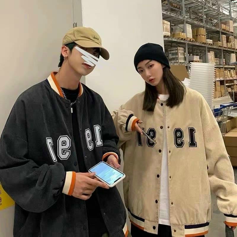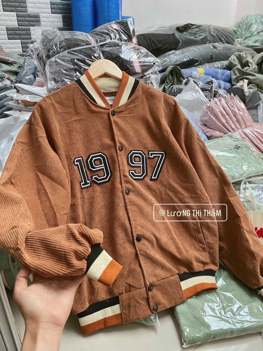 Áo khoác bomber kaki nhung bóng chày unisex form rộng 1997 nam nữ ulzzang