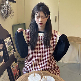 ✨Áo kiểu Dệt Kim Cổ Tròn Không Tay Họa Tiết Caro Thời Trang Cho Nữ