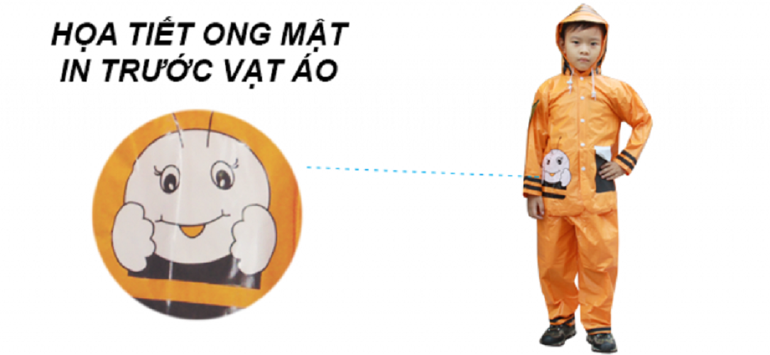 Kiểu dáng áo mưa nhỏ gọn, trẻ trung cùng họa tiết hình chú ong mật ngộ nghĩnh, đáng yêu, chắc chắn sẽ khiến các bé trai thích áo mưa này và không ngại mặc khi trời mưa. Sản phẩm có 3 màu sắc cho bạn dễ dàng lựa chọn cho bé: Cam - Xanh dương - Đỏ