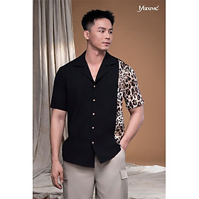 - Áo sơmi đen tay ngắn, cổ tim phối hoạ tiết da beo bên phần cánh tay và thân áo, mang lại vẻ ngoài phóng khoáng và trẻ trung cho người mặc