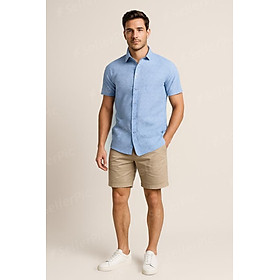 Thiết kế hiện đại: Áo sơ mi tay ngắn với gam màu xanh dịu mát cùng họa tiết sọc cách điệu độc đáo, mang đến vẻ ngoài trẻ trung và lịch lãm.