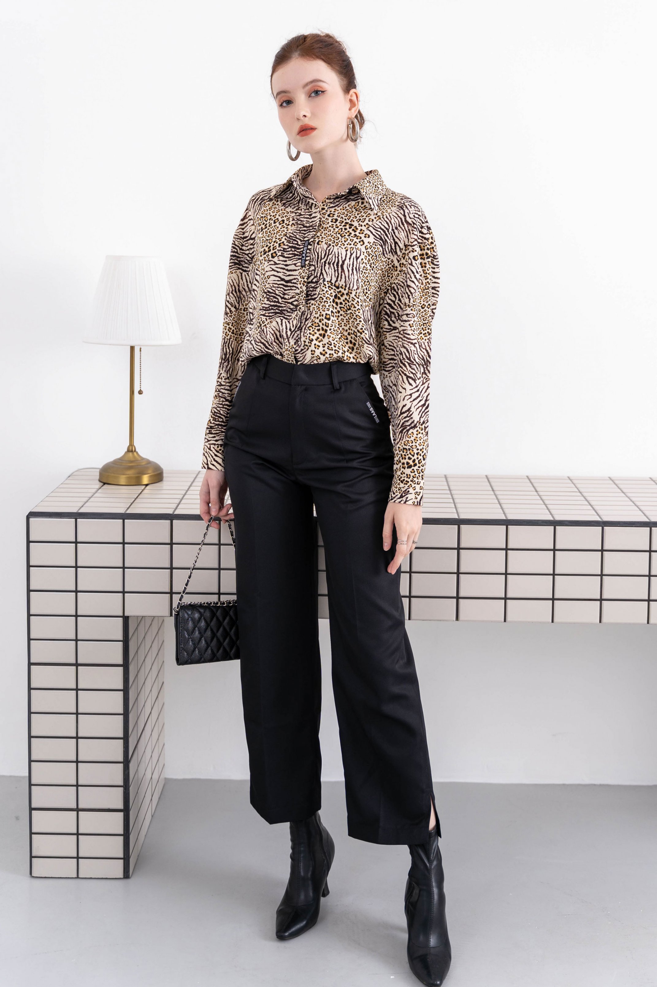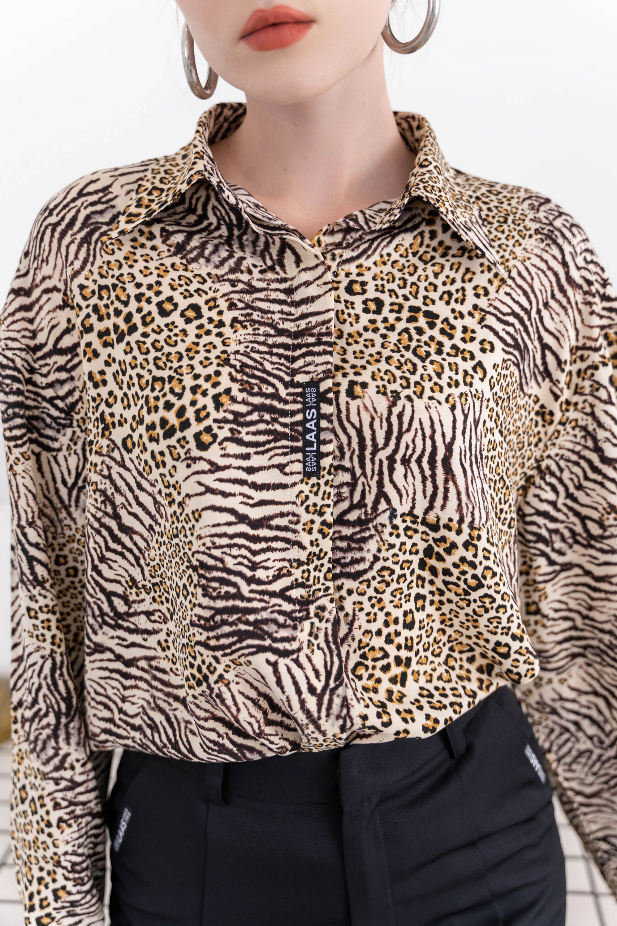 Áo sơ mi La Mộc họa tiết da beo thể hiện được nữ quyền. Thiết kế tay lỡ phồng và nhún nhẹ mang đến cảm giác thanh lịch cho nàng. Thiết kế với sự chỉnh