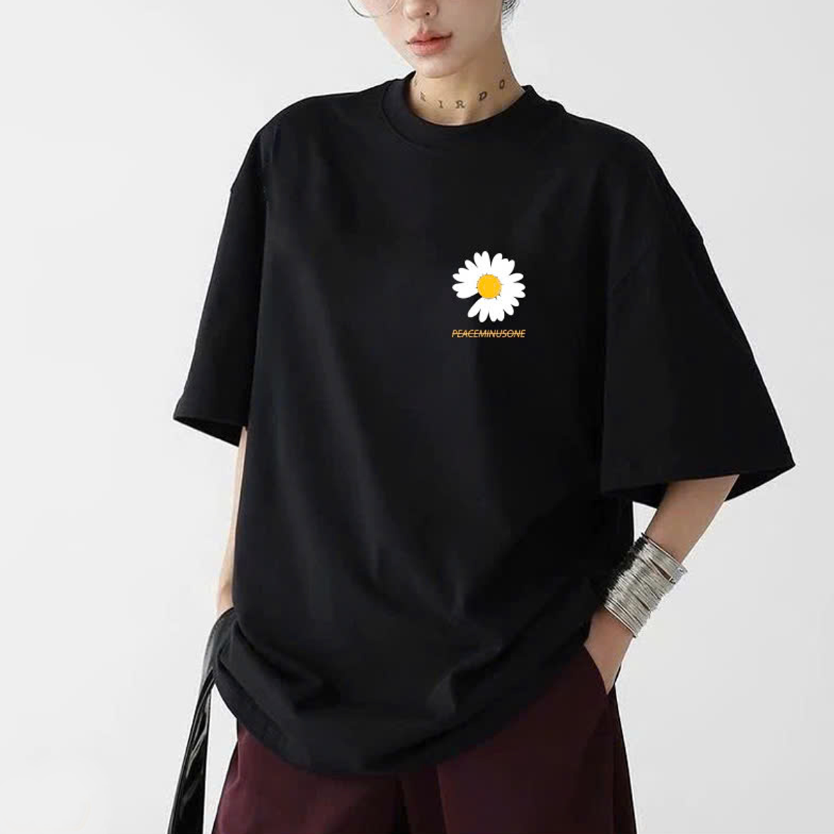 ✨Áo Thun Nữ 100% Cotton Màu Đen In Hoa Cúc Trắng