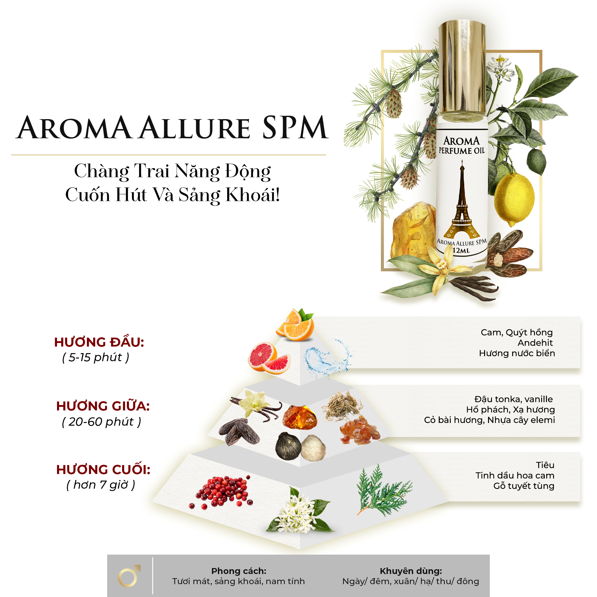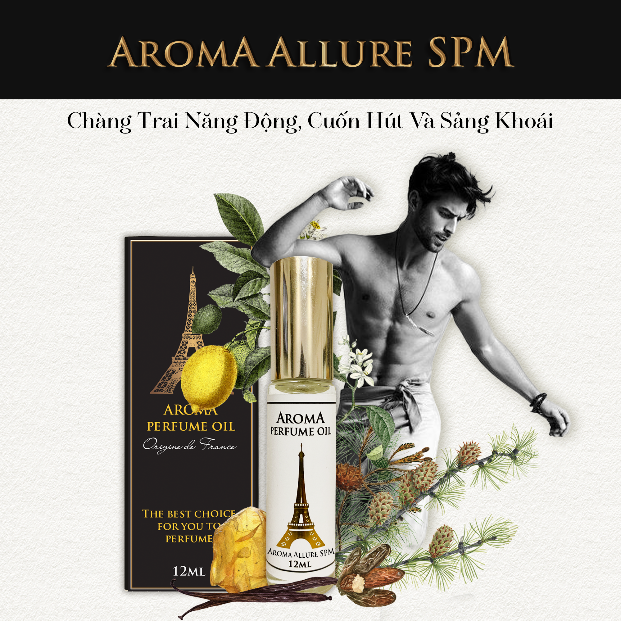 Nhằm mang đến sự tự tin quyến rũ cho cơ thể nam giới, tinh dầu nước hoa Pháp Aroma Allure SPM tập trung vào 4 yếu tố chính đó là sự sảng khoái, gợi cảm đầy quyến rũ của hương gỗ và vị cay của các nguyên liệu tự nhiên.