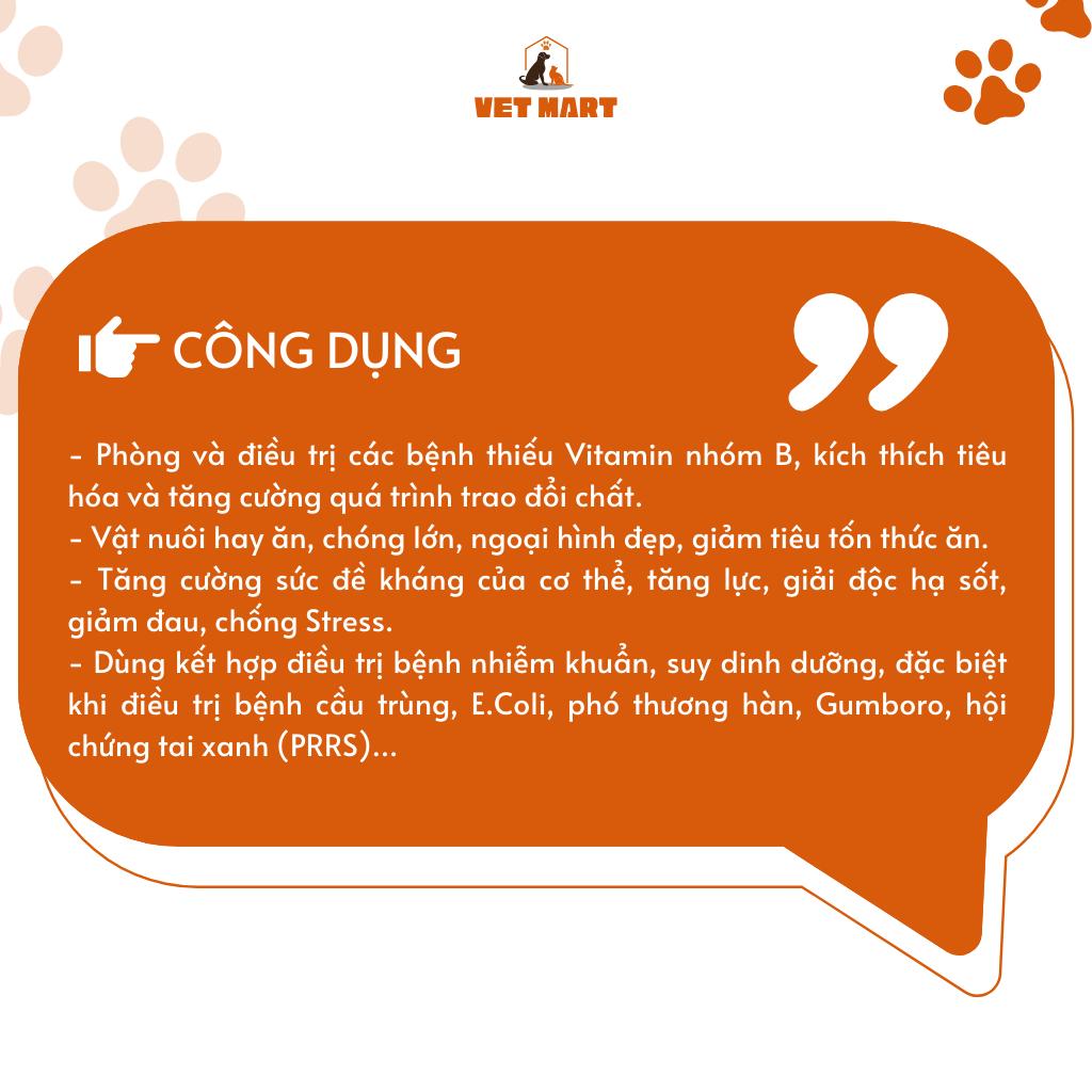Đối tượng: Lợn, gia súc, Trâu, Bò, Lợn, gia súc, Gia súc khác, Dê, Cừu, Gia cầm, thủy cầm ️THÀNH PHẦN: Vitamin C 700 mg Vitamin B1 (Min) 1200 mg Vitamin B5 (Min) 50 mg