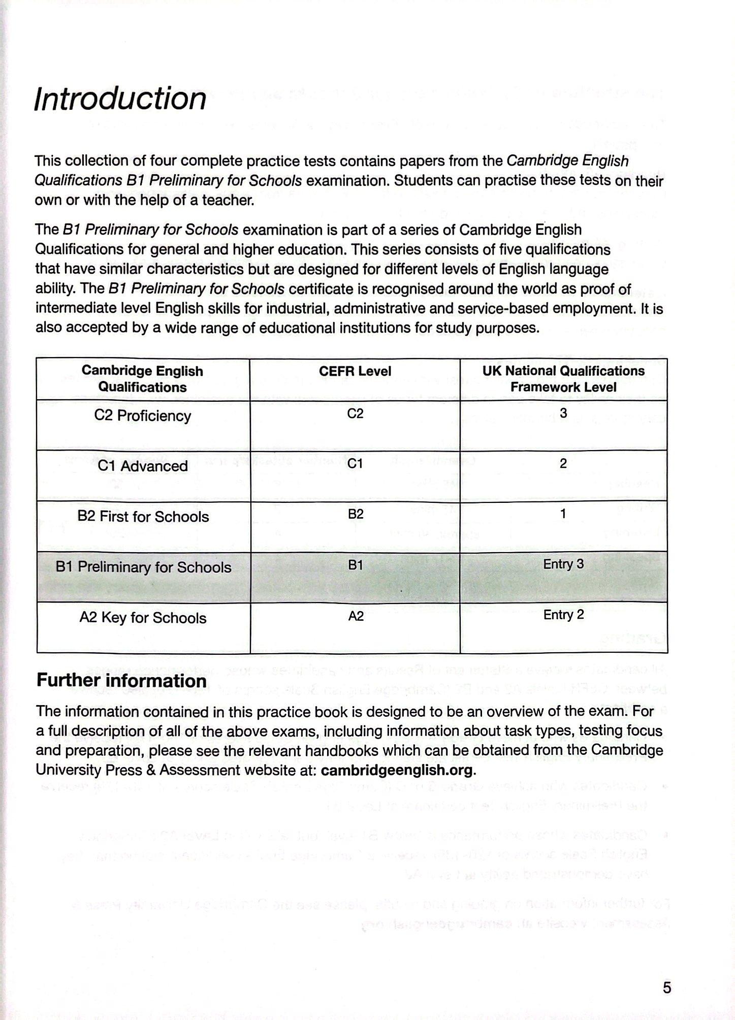 Inside B1 Preliminary for Schools for the revised 2020 exam you'll find four complete examination papers from Cambridge Assessment English. Be confident on exam day by working through each part of the exam and scoring system so you can familiarise yourself with the format and practise your exam technique. The book contains transcripts, sample Writing answers, scripts for the Speaking test, and sample answer sheets. Download the audio for the Listening tests, example Speaking test video and answer keys with extra explanations (instructions on inner front cover), or access your audio and video directly via QR codes in the book.