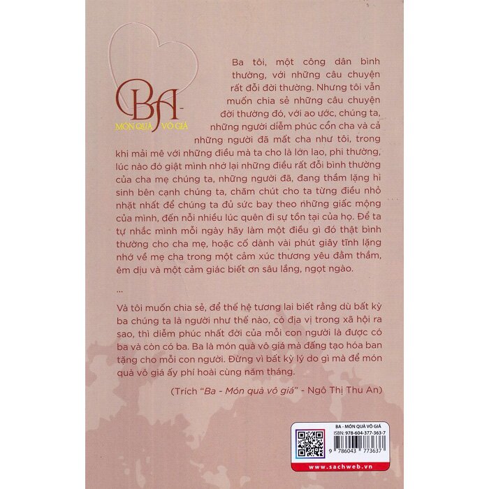 Và tôi muốn chia sẻ, để thế hệ tương lai biết rằng dù bất kỳ ba chúng ta là người như thế nào, có địa vị trong xã hội ra sao, thì diễm phúc nhất đời của mỗi con người là được có ba và còn có ba. Ba là món quà vô giá mà đấng tạo hóa ban tặng cho mỗi con người. Đừng vì bất kỳ lý do gì mà để món quà vô giá ấy phí hoài cùng năm tháng.