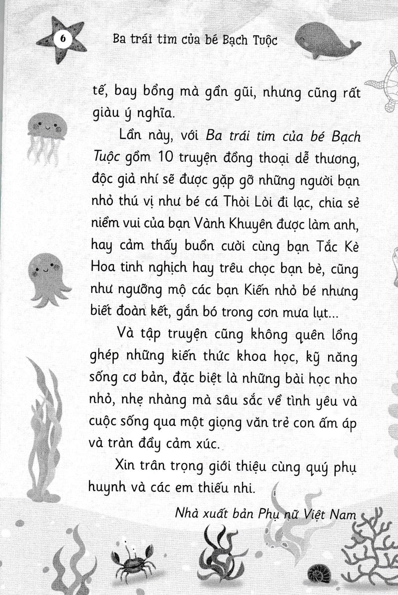 Mua tại TiktokBa Trái Tim Của Của Bạch Tuộc - Truyện Đồng Thoại Bằng sự quý mến đặc biệt dành cho các bạn đọc nhỏ tuổi, nhà văn đã luôn mang đến cho thiếu nhi những câu chuyện đáng yêu, ngộ nghĩnh mà ở đó, các bạn có thể bước vào một một thế giới trẻ thơ trong trẻo mà kỳ diệu, thơ mộng và thực