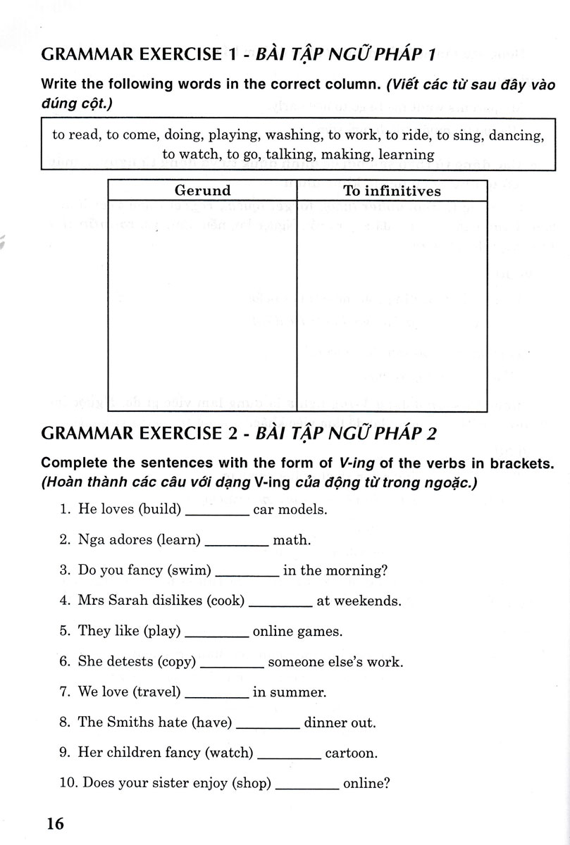 Bên cạnh đó, sách đưa vào một số bài tập theo từng chủ điểm để các em rèn luyện thêm. Đặc biệt các bài Review sẽ là cơ hội để các em ôn tập lại những kiến thức đã học, đồng thời tự kiểm tra khả năng ghi nhớ của mình về các chủ điểm từ vựng và ngữ pháp sau mỗi ba bài học. Ngoài ra, còn có phần đáp án gợi ý ở cuối sách để các em có thể tham khảo, đối chiếu sau khi làm xong các bài tập, xem phần trả lời của mình đã đúng hay chưa. Nếu chưa đúng thì cần phải xác định tại sao chưa đúng để có sự chỉnh sửa kịp thời, từ đó dần tiến bộ hơn. Nắm vững từ vựng và cấu trúc ngữ pháp trong cuốn sách này thì chắc chắn việc học các kĩ năng nghe, nói, đọc, viết trong sách giáo khoa Tiếng Anh 8 sẽ trở nên dễ dàng hơn với các em.