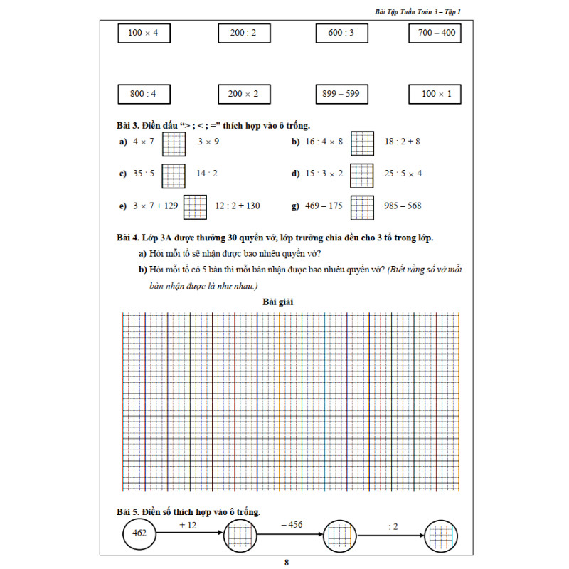 Bài Tập Tuần Toán 3 - Tập 1 được biên soạn theo tuần dựa trên nội dung bộ sách giáo khoa giáo khoa hiện hành lớp 3.