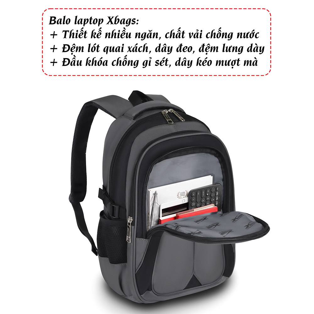 Balo chống sốc laptop XBags này có 2 ngăn chính và nhiều ngăn phụ, Balo chống sốc laptop này có nhiều ngăn, túi nhỏ khác nhau rất tiện dụng để các vật dụng khác như sách vở, dụng cụ học tập....