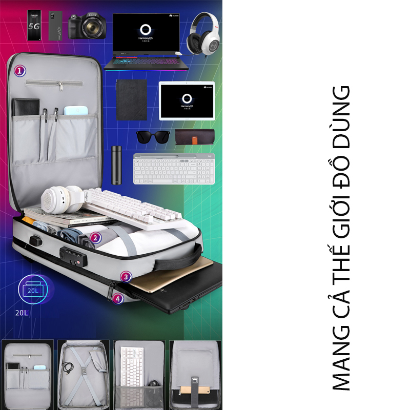 Chức năng: thoáng khí, chống mài mòn, dễ làm sáng, chống sốc, có sạc điện thoại, khóa chống trộm
