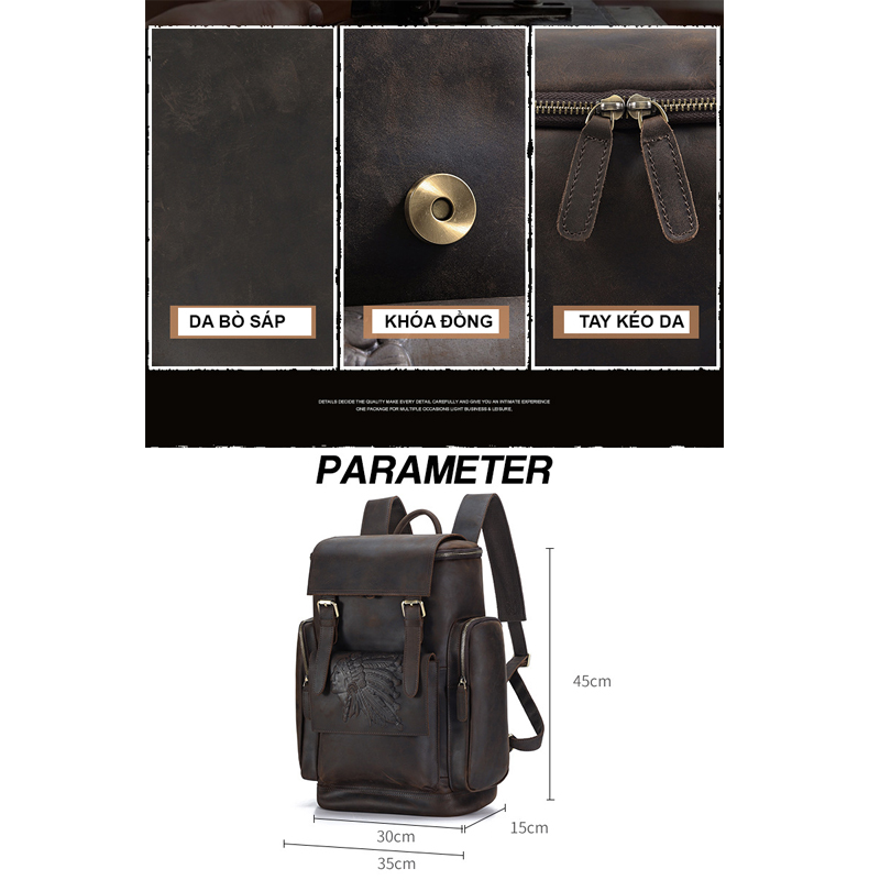 Kích thước : rộng 28cm X cao 41cm X dày 12cm Trọng lượng: 1.1kg Màu sắc: Đen Phương pháp sản xuất: công nghệ cao Chất liệu : Da Bò thật, phụ kiện kim loại không