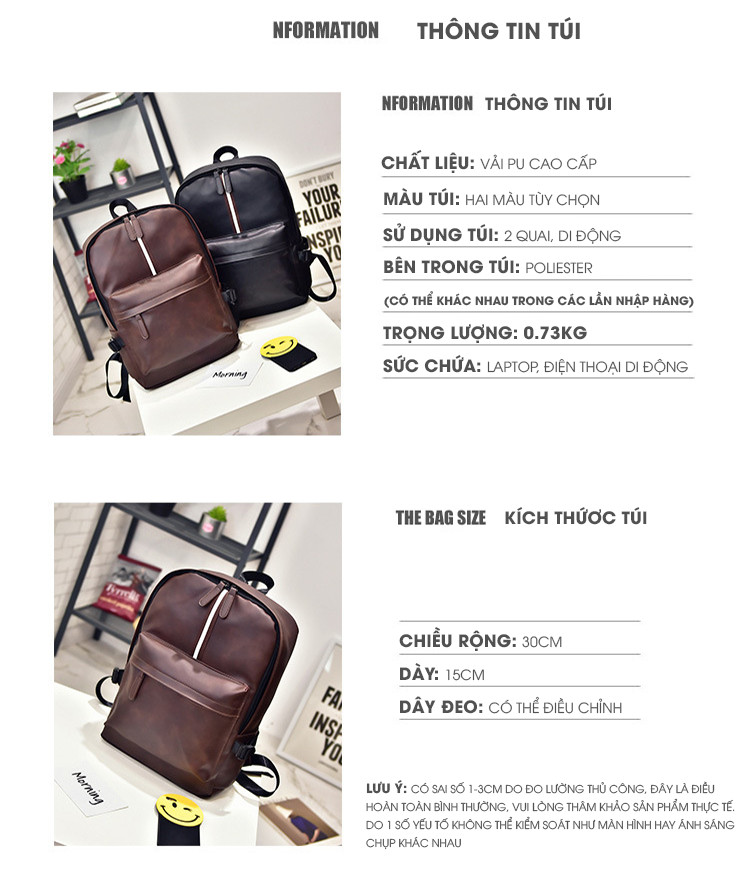 Kích thước : rộng 27cm X cao 32cm X dày 13cm Trọng lượng: 0.5 kg Phương pháp sản xuất: công nghệ cao Chất liệu : Da PU cao cấp Chức năng: chống mài mòn, dễ