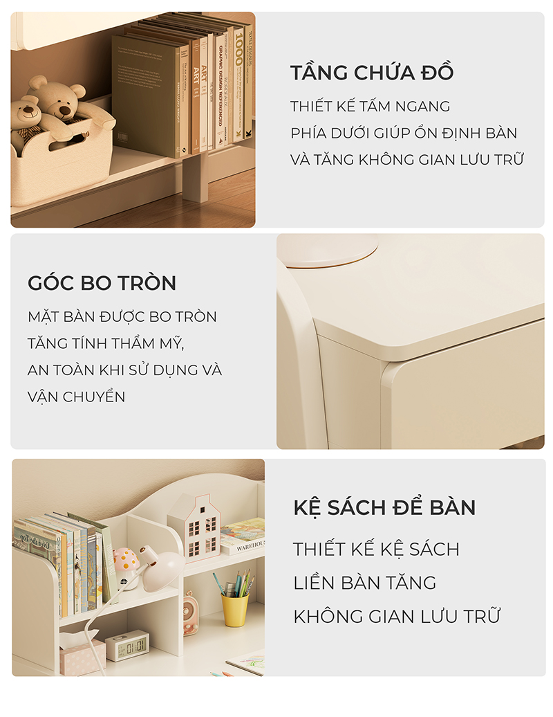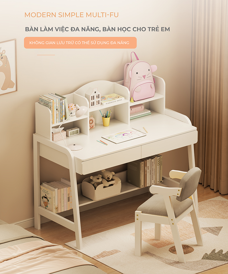 Công năng: Là mẫu bàn học cho trẻ em thiết kế hiện đại và đẹp mắt, sở hữu nhiều kệ và ngăn kéo giúp việc học của bé hiệu quả.