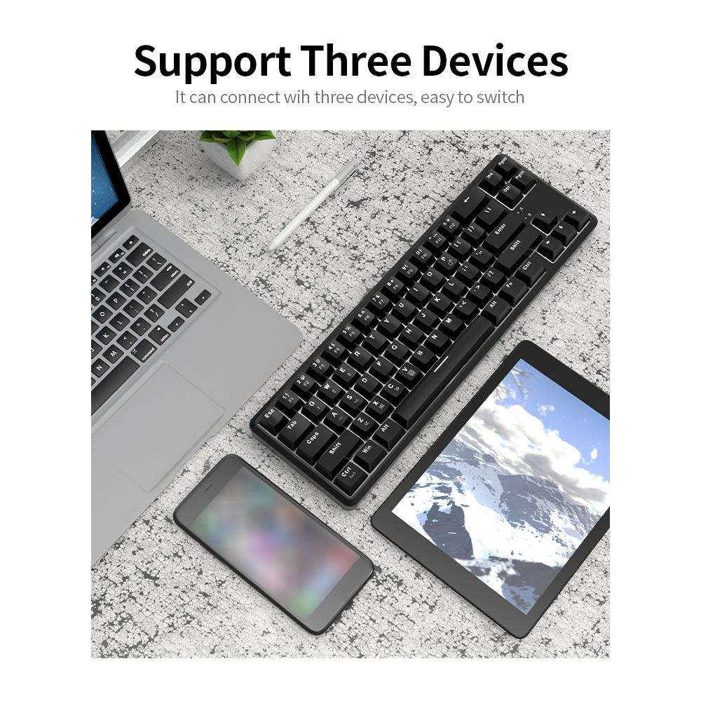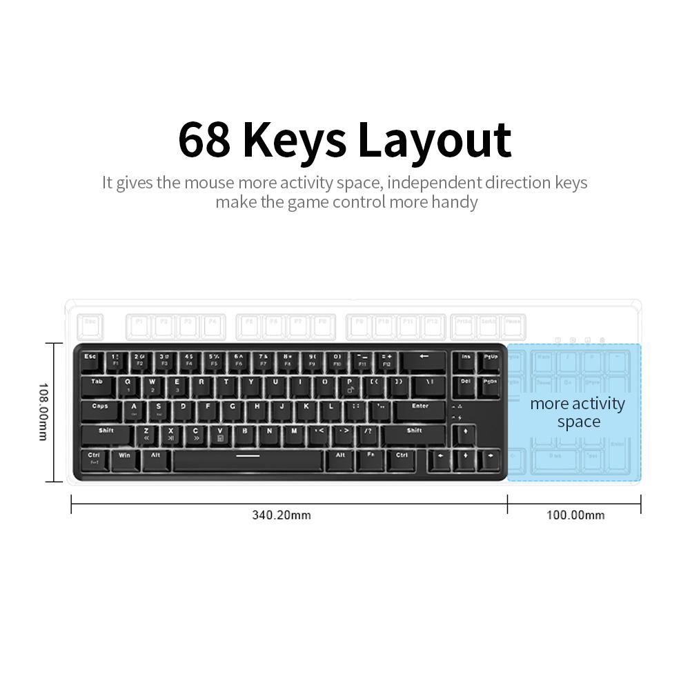 Features: USB wired/BT dual-mode connection, support multiple devices. It can connect wih three devices, easy to switch. 68 keys compact layout, gives the mouse more activity space, independent direction keys make the game control more