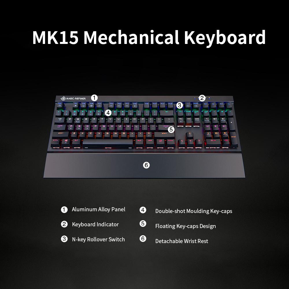 Description: The Magic Refiner MK15 features floating key-caps which are proper arranged on the aluminum alloy mate panel, giving you very comfortable hand feeling. Blue switch will improve typing accuracy and give you a good
