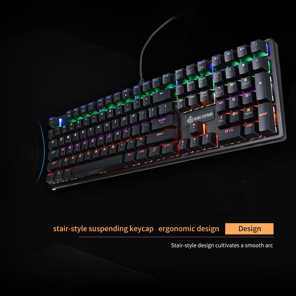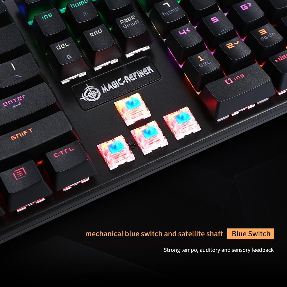 MAGIC-REFINER Mechanical Keyboard is designed for game player. 108 N-keyrollover key and 10 styles cool backlit gives you ultimate game experience.Mechanical blue switch brings quick response and let you enjoy smooth gameplaying. Support both English