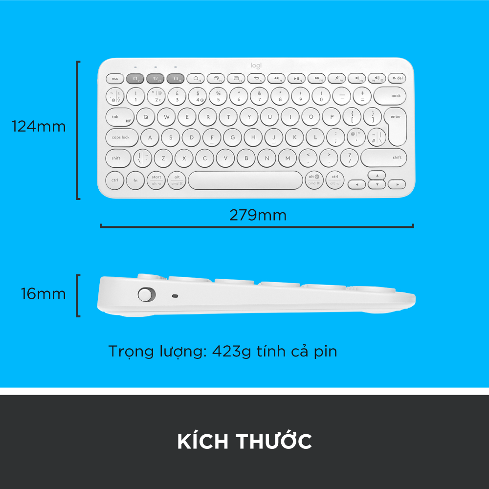 Bàn phím không dây Logitech K580 Slim Kích thước bàn phím - Chiều cao: 5,6 in (143,9 mm) - Chiều rộng: 14,7 in (373,5 mm) - Chiều sâu: 0,83 in (21,3 mm) - Trọng lượng
