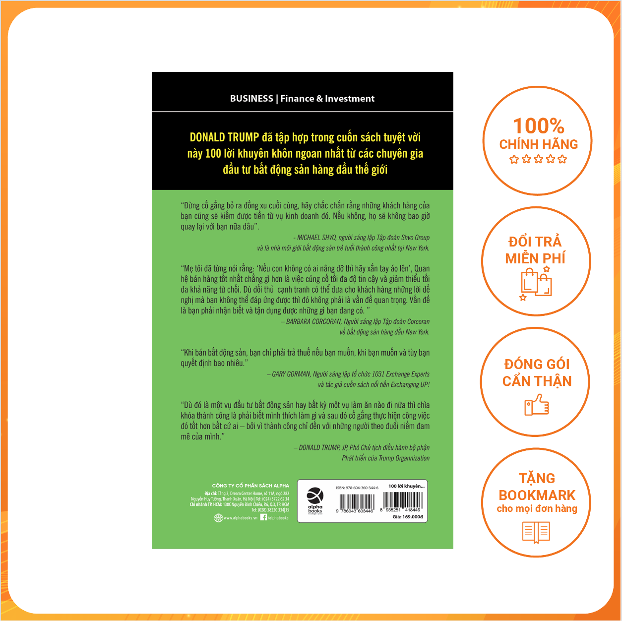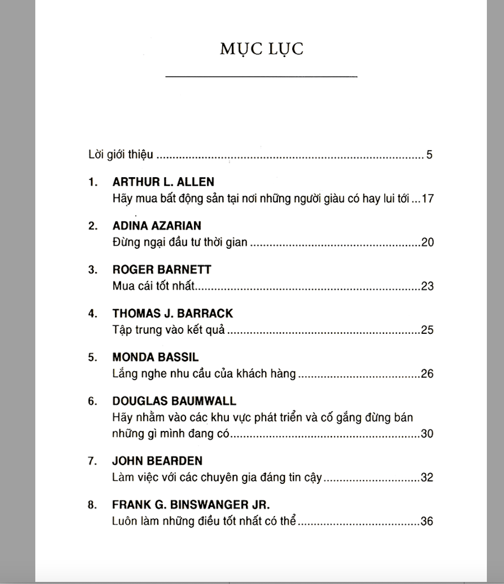 100 Lời Khuyên Đầu Tư Bất Động Sản Khôn Ngoan Nhất (Tái Bản 2018) Tôi đã ấp ủ mong muốn được viết cuốn sách này trong nhiều năm ròng. Ai đã từng theo dõi sự nghiệp của tôi đều biết các chiến lược bất động sản mà tôi sử dụng. (Và nếu chưa từng biết đến sự nghiệp của tôi thì bây giờ chính là lúc theo dõi các chương trình về tôi trên ti vi hay mua một trong những cuốn sách tôi đã viết) Mặc dù rất thành công nhưng công việc kinh doanh bất động sản của tôi không bao gồm tất cả các mặt của lĩnh vực này. Những gì tôi biết thì tôi nắm rất chắc, nhưng, tôi không có ý độc quyền về các ý tưởng và sự khôn ngoan trong kinh doanh bất động sản. Tôi không thể biết hết mọi thứ. Đúng như Susan Penzer nhận xét, điều làm nên thành công của tôi chính là “khả năng thu thập những thông tin tốt nhất từ những người thông minh nhất.” Susan đã đưa ra nhận xét này sau khi theo dõi cách tôi thực hiện các hoạt động kinh doanh. Và nhận xét đó cũng đúng với những gì tôi thực hiện trong cuốn sách này, đó là thu thập những thông tin hay nhất từ những người thông minh nhất trong lĩnh vực bất động sản. Họ chia sẻ những kinh nghiệm và những bài học mà họ đã học được từ người khác cũng như từ những sai lầm họ đã mắc. 100 lời khuyên đầu tư bất động sản khôn ngoan nhất chính là tập hợp những lời khuyên khôn ngoan sáng suốt của 100 nhà kinh doanh bất động sản hàng đầu. Đây là loại thông tin và sự khôn ngoan mà bạn chỉ có thể nhận được từ kinh nghiệm sống. Trong cuốn sách này, bạn sẽ thấy sự sáng suốt khác thường có được là nhờ vào những kinh nghiệm và bài học mà những nhân vật có thế lực trong kinh doanh bất động sản trên khắp nước Mỹ phải trải bao khó khăn mới rút ra được. Có rất nhiều điều mà lẽ ra tất cả chúng ta đã có thể làm tốt hơn: từ việc bỏ lỡ cơ hội, dự đoán sai về thị trường đến việc thương lượng quá cao hoặc quá thấp. Những nhà kinh doanh này - cả nam lẫn nữ - sẽ kể cho bạn biết họ đã học được gì. Trong số những người đóng góp cho cuốn sách này, có người là bạn tôi, cũng có người tôi chưa từng gặp mặt, dù tôi luôn ngưỡng mộ họ từ xa. Cuốn sách này là bản tóm tắt hoàn hảo nhất những lời khuyên trong kinh doanh bất động sản được thu thập từ trước tới nay. Và tôi cho rằng nó đã hoàn tất sứ mệnh của mình: cung cấp cho bạn những lời khuyên bổ ích, giúp bạn lập kế hoạch để chính mình thành công trong lĩnh vực bất động sản. Dù bạn mua hay bán nhà của bạn, nhà tập thể hoặc trả góp; dù bạn đang hoạt động hay mới bước chân vào lĩnh vực kinh doanh bất động sản, tôi nghĩ rằng bạn sẽ học được rất nhiều từ cuốn sách này.