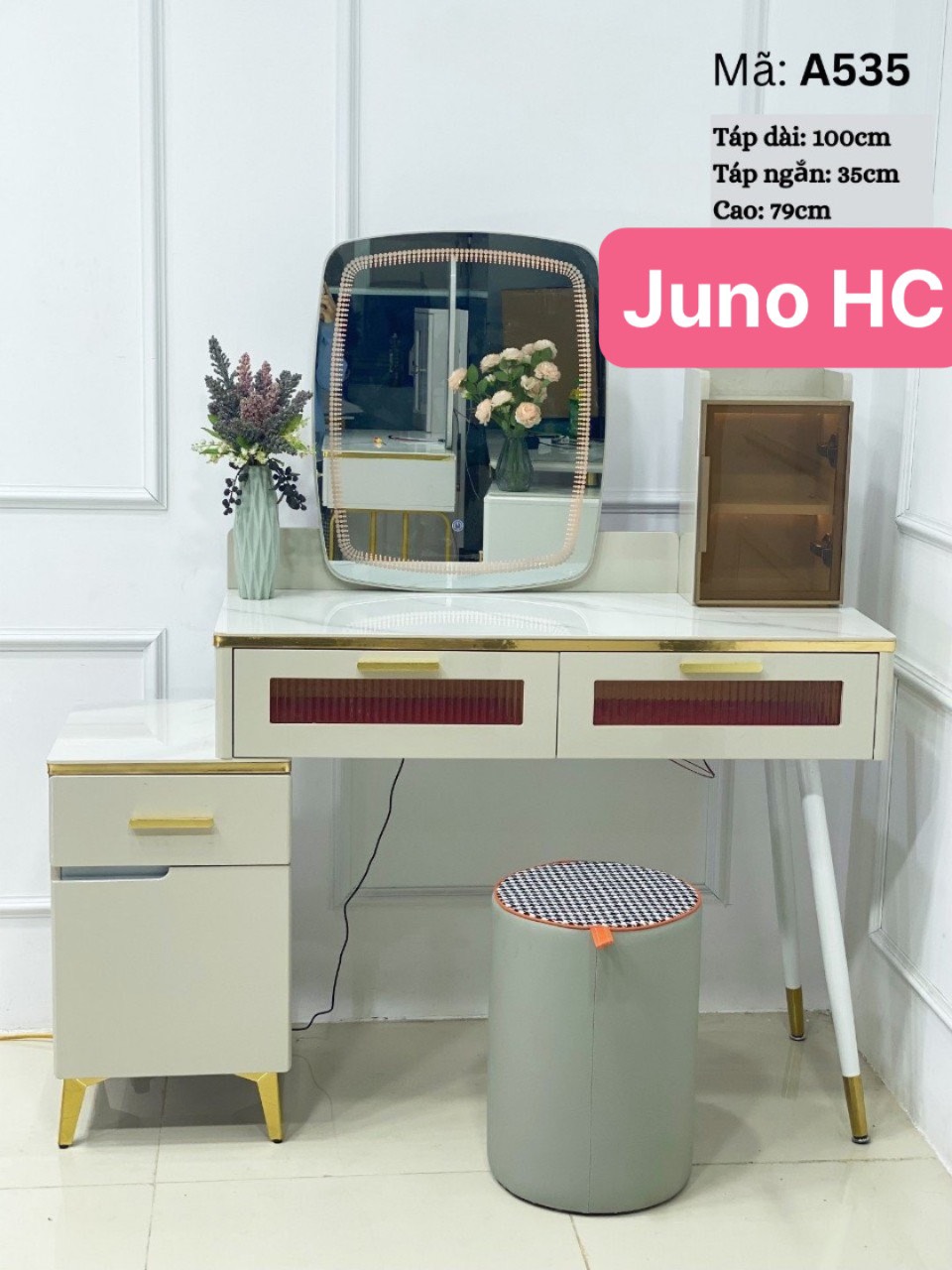 ✨Bàn trang điểm HC Juno Sofa bọc da mặt kính gương led cảm ứng