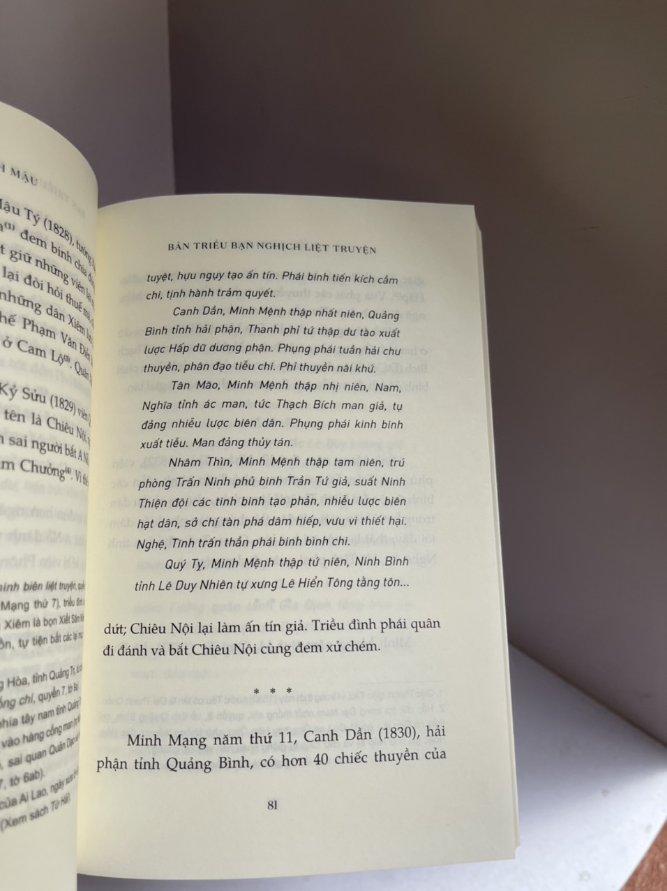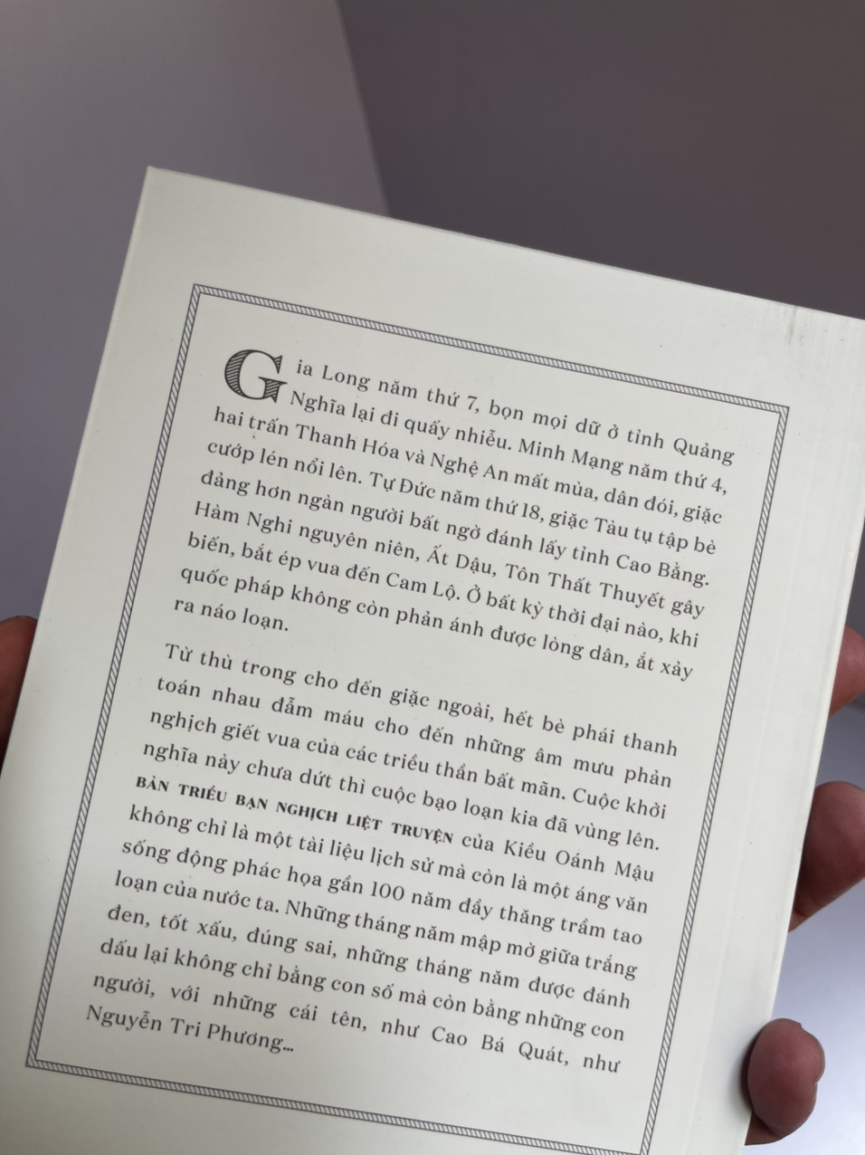 Từ thù trong cho đến giặc ngoài, hết bè phái thanh toán nhau đẫm máu cho đến những âm mưu phản nghịch giết vua của các triều thần bất mãn. Cuộc khởi nghĩa này chưa dứt thì cuộc bạo loạn kia đã vùng lên. Bản triều bạn nghịch liệt truyện của Kiều Oánh Mậu không chỉ là một tài liệu lịch sử mà còn là một áng văn sống động phác họa gần 100 năm đầy thăng trầm tao loạn của nước ta. Những tháng năm mập mờ giữa trắng đen, tốt xấu, đúng sai, những tháng năm được đánh dấu lại không chỉ bằng con số mà còn bằng những con người, với những cái tên, như Cao Bá Quát, như Nguyễn Tri Phương…